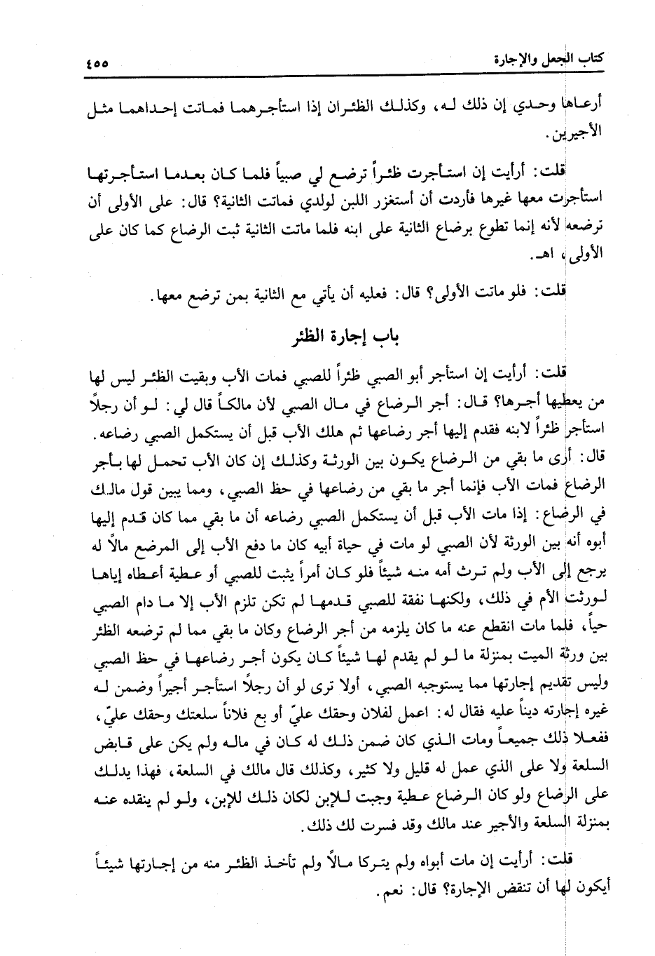 ِ قُلْتُ: أَرَأَيْتَ إنْ اسْتَأْجَرَ أَبُو الصَّبِيِّ ظِئْرًا لِلصَّبِيِّ فَمَاتَ الْأَبُ وَبَقِيَتْ الظِّئْرُ لَيْسَ لَهَا مَنْ يُعْطِيهَا أَجْرَهَا؟ قَالَ: أَجْرُ الرَّضَاعِ فِي مَالِ الصَّبِيِّ؛ لِأَنَّ مَالِكًا قَالَ لِي: لَوْ أَنَّ رَجُلًا اسْتَأْجَرَ ظِئْرًا لِابْنِهِ فَقَدَّمَ إلَيْهَا أَجْرَ رَضَاعِهَا، ثُمَّ هَلَكَ الْأَبُ قَبْلَ أَنْ يَسْتَكْمِلَ الصَّبِيُّ رَضَاعَهُ. قَالَ: أَرَى مَا بَقِيَ مِنْ الرَّضَاعِ يَكُونُ بَيْنَ الْوَرَثَةِ وَكَذَلِكَ إنْ كَانَ الْأَبُ تَحَمَّلَ لَهَا بِأَجْرِ الرَّضَاعِ فَمَاتَ الْأَبُ فَإِنَّمَا أَجْرُ مَا بَقِيَ مِنْ رَضَاعِهَا فِي حَظِّ الصَّبِيِّ، وَمِمَّا يُبَيِّنُ قَوْلَ مَالِكٍ فِي الرَّضَاعِ: إذَا مَاتَ الْأَبُ قَبْلَ أَنْ يَسْتَكْمِلَ الصَّبِيُّ رَضَاعَهُ أَنَّ مَا بَقِيَ مِمَّا كَانَ قَدَّمَ إلَيْهَا أَبُوهُ أَنَّهُ بَيْنَ الْوَرَثَةِ؛ لِأَنَّ الصَّبِيَّ لَوْ مَاتَ فِي حَيَاةِ أَبِيهِ كَانَ مَا دَفَعَ الْأَبُ إلَى الْمُرْضِعِ مَالًا لَهُ يَرْجِعُ إلَى الْأَبِ وَلَمْ تَرِثْ أُمُّهُ مِنْهُ شَيْئًا فَلَوْ كَانَ أَمْرًا يَثْبُتُ لِلصَّبِيِّ أَوْ عَطِيَّةً أَعْطَاهُ إيَّاهَا لَوَرِثَتْ الْأُمُّ فِي ذَلِكَ، وَلَكِنَّهَا نَفَقَةٌ لِلصَّبِيِّ قَدَّمَهَا لَمْ تَكُنْ تَلْزَمُ الْأَبَ إلَّا مَا دَامَ الصَّبِيُّ حَيًّا، فَلَمَّا مَاتَ انْقَطَعَ عَنْهُ مَا كَانَ يَلْزَمُهُ مِنْ أَجْرِ الرَّضَاعِ وَكَانَ مَا بَقِيَ مِمَّا لَمْ تُرْضِعْهُ الظِّئْرُ بَيْنَ وَرَثَةِ الْمَيِّتِ بِمَنْزِلَةِ مَا لَوْ لَمْ يُقَدِّمُ لَهَا شَيْئًا كَأَنْ يَكُونَ أَجْرُ رَضَاعِهَا فِي حَظِّ الصَّبِيِّ وَلَيْسَ تَقْدِيمُ إجَارَتِهَا مِمَّا يَسْتَوْجِبُهُ الصَّبِيُّ، أَوَلَا تُرَى لَوْ أَنَّ رَجُلًا اسْتَأْجَرَ أَجِيرًا وَضَمِنَ لَهُ غَيْرُهُ إجَارَتَهُ دَيْنًا عَلَيْهِ فَقَالَ لَهُ: اعْمَلْ لِفُلَانٍ وَحَقُّك عَلَيَّ أَوْ بِعْ فُلَانًا سِلْعَتَكَ وَحَقُّك عَلَيَّ، فَفَعَلَا ذَلِكَ جَمِيعًا وَمَاتَ الَّذِي كَانَ ضَمِنَ ذَلِكَ لَهُ كَانَ فِي مَالِهِ وَلَمْ يَكُنْ عَلَى قَابِضِ السِّلْعَةِ وَلَا عَلَى الَّذِي عَمِلَ لَهُ قَلِيلٌ وَلَا كَثِيرٌ، وَكَذَلِكَ قَالَ مَالِكٌ فِي السِّلْعَةِ، فَهَذَا يَدُلُّكَ عَلَى الرَّضَاعِ وَلَوْ كَانَ الرَّضَاعُ عَطِيَّةً وَجَبَتْ لِلِابْنِ لَكَانَ ذَلِكَ لِلِابْنِ، وَلَوْ لَمْ يَنْقُدْهُ عَنْهُ بِمَنْزِلَةِ السِّلْعَةِ وَالْأَجِيرِ عِنْدَ مَالِكٍ وَقَدْ فَسَّرْتُ لَكَ ذَلِكَ.