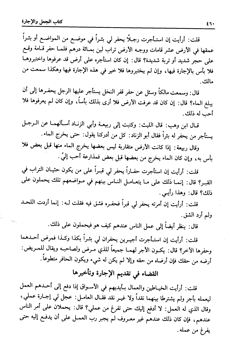 قُلْتُ: أَرَأَيْتَ إنْ اسْتَأْجَرْت رَجُلًا يَحْفِرُ لِي بِئْرًا فِي مَوْضِعٍ مَنْ الْمَوَاضِعِ أَوْ بِئْرًا عُمْقُهَا فِي الْأَرْضِ عَشْرُ قَامَاتٍ وَوَجْهُ الْأَرْضِ تُرَابٌ لِينٌ بِمِائَةِ دِرْهَمٍ فَلَمَّا حَفَرَ قَامَةً وَقَعَ عَلَى حَجَرٍ شَدِيدٍ أَوْ تُرْبَةٍ شَدِيدَةٍ؟ قَالَ: إنْ كَانَ اسْتَأْجَرَهُ عَلَى أَرْضٍ قَدْ عَرَفُوهَا وَاخْتَبَرُوهَا فَلَا بَأْسَ بِالْإِجَارَةِ فِيهَا، وَإِنْ لَمْ يَخْتَبِرُوهَا فَلَا خَيْرَ فِي هَذِهِ الْإِجَارَةِ فِيهَا وَهَكَذَا سَمِعْتُ مِنْ مَالِكٍ.