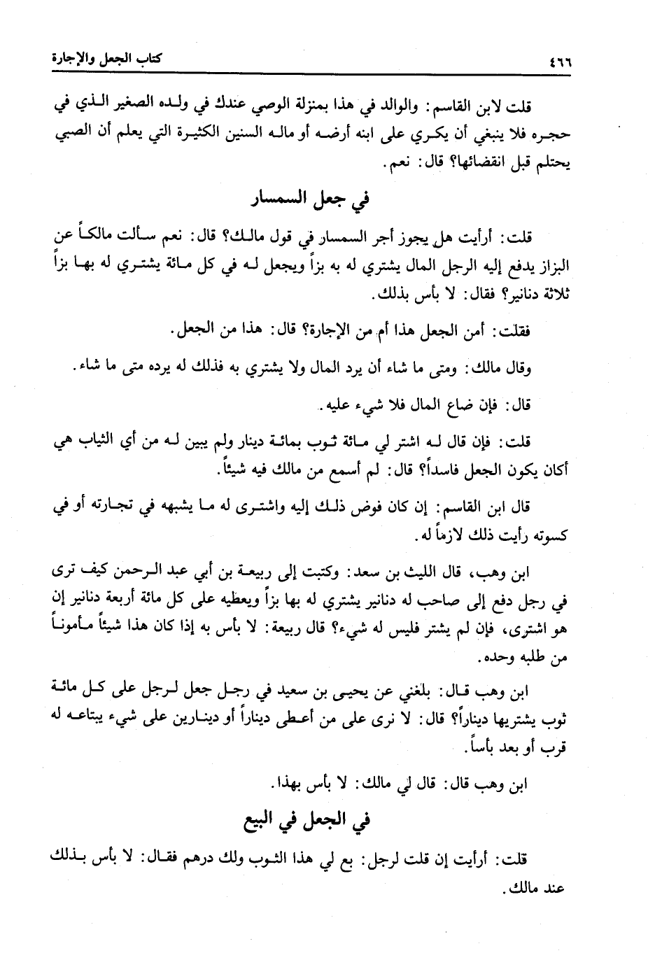 فِي جُعْلِ السِّمْسَارِ قُلْتُ: أَرَأَيْتَ هَلْ يَجُوزُ أَجْرُ السِّمْسَارِ فِي قَوْلِ مَالِكٍ؟ قَالَ: نَعَمْ سَأَلْتُ مَالِكًا عَنْ الْبَزَّازِ يَدْفَعُ إلَيْهِ الرَّجُلُ الْمَالَ يَشْتَرِي لَهُ بِهِ بَزًّا وَيَجْعَلُ لَهُ فِي كُلِّ مِائَةٍ يَشْتَرِي لَهُ بِهَا بَزًّا ثَلَاثَةَ دَنَانِيرَ؟ فَقَالَ: لَا بَأْسَ بِذَلِكَ. فَقُلْتُ: أَمِنْ الْجُعْلِ هَذَا أَمْ مَنْ الْإِجَارَةِ؟ قَالَ: هَذَا مِنْ الْجُعْلِ. وَقَالَ مَالِكٌ: وَمَتَى مَا شَاءَ أَنْ يَرُدَّ الْمَالَ وَلَا يَشْتَرِي بِهِ فَذَلِكَ لَهُ يَرُدُّهُ مَتَى مَا شَاءَ. قَالَ: فَإِنْ ضَاعَ الْمَالُ فَلَا شَيْءَ عَلَيْهِ.