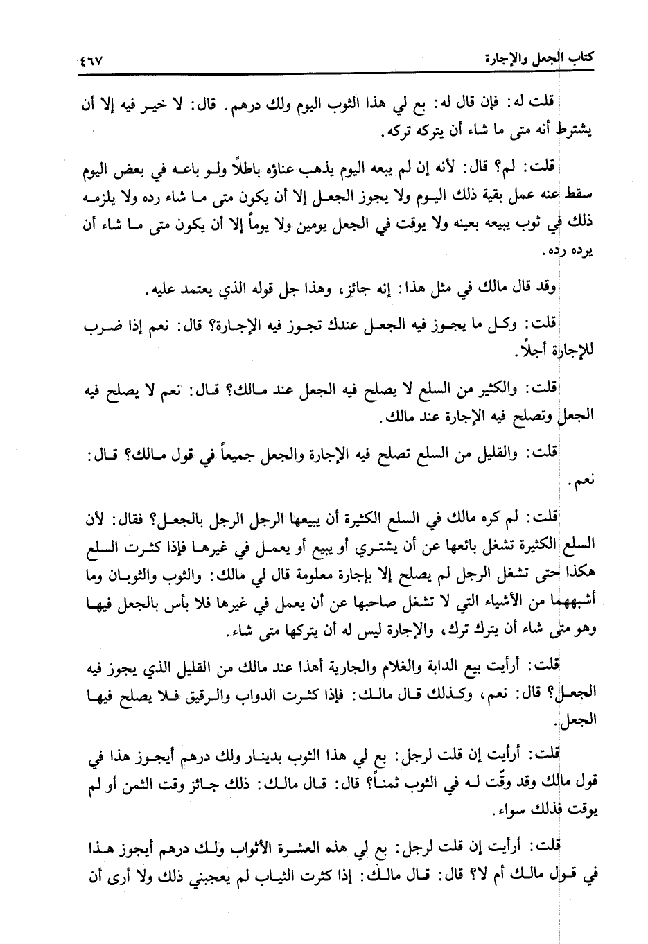 قُلْتُ: لِمَ كَرِهَ مَالِكٌ فِي السِّلَعِ الْكَثِيرَةِ أَنْ يَبِيعَهَا الرَّجُلُ الرَّجُلَ بِالْجُعْلِ؟ فَقَالَ: لِأَنَّ السِّلَعَ الْكَثِيرَةَ تُشْغِلُ بَائِعَهَا عَنْ أَنْ يَشْتَرِيَ أَوْ يَبِيعَ أَوْ يَعْمَلَ فِي غَيْرِهَا فَإِذَا كَثُرَتْ السِّلَعُ هَكَذَا حَتَّى تُشْغِلَ الرَّجُلَ لَمْ يَصْلُحْ إلَّا بِإِجَارَةٍ مَعْلُومَةٍ قَالَ لِي مَالِكٌ: وَالثَّوْبُ وَالثَّوْبَانِ وَمَا أَشْبَهَهُمَا مِنْ الْأَشْيَاءِ الَّتِي لَا تَشْغَلُ صَاحِبَهَا عَنْ أَنْ يَعْمَلَ فِي غَيْرِهَا فَلَا بَأْسَ بِالْجُعْلِ فِيهَا وَهُوَ مَتَى شَاءَ أَنْ يَتْرُكَ تَرَكَ، وَالْإِجَارَةُ لَيْسَ لَهُ أَنْ يَتْرُكَهَا مَتَى شَاءَ.