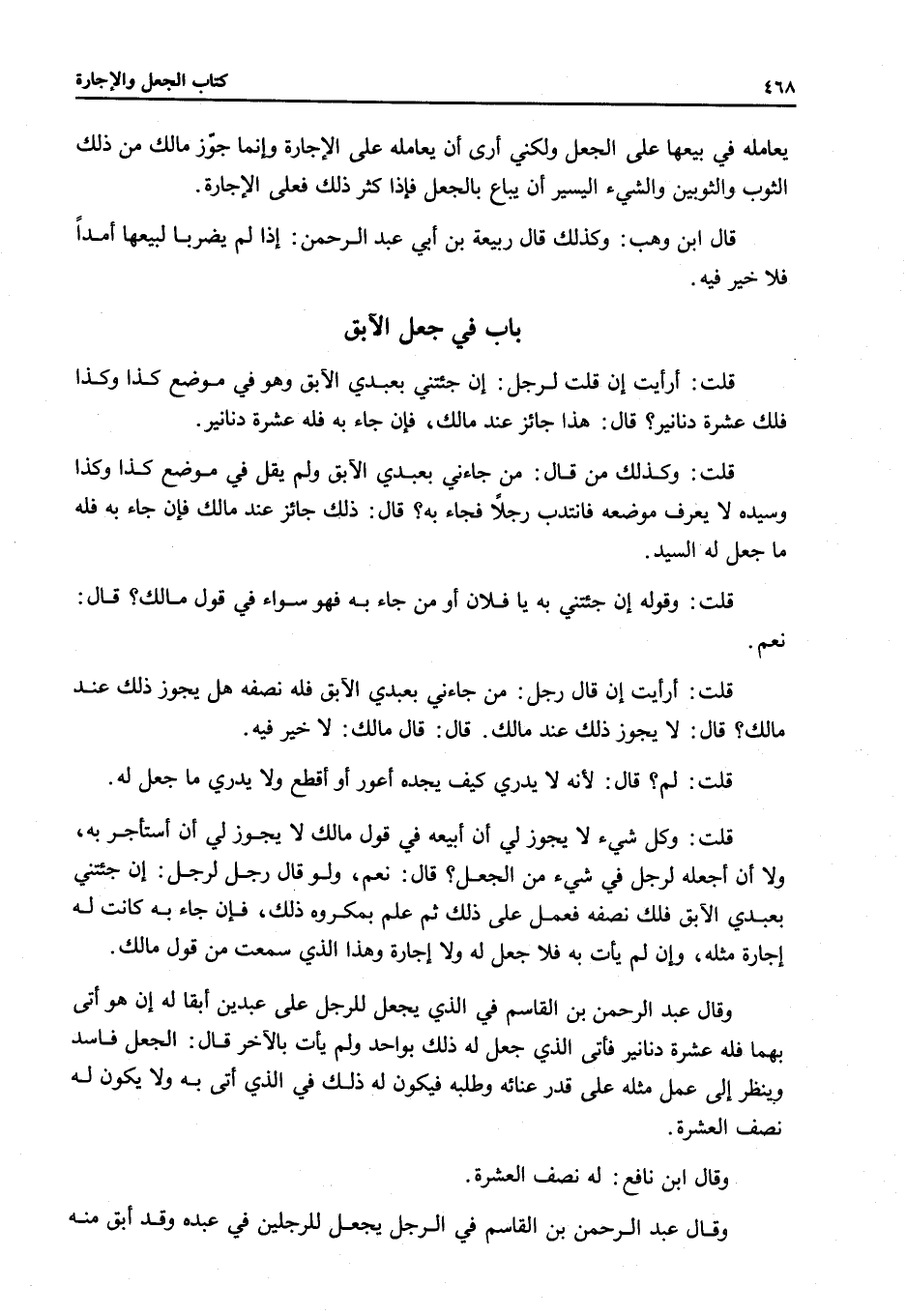 قُلْتُ: أَرَأَيْتَ إنْ قَالَ رَجُلٌ: مَنْ جَاءَنِي بِعَبْدِي الْآبِقِ فَلَهُ نِصْفُهُ هَلْ يَجُوزُ ذَلِكَ عِنْدَ مَالِكٍ؟ قَالَ: لَا يَجُوزُ ذَلِكَ عِنْدَ مَالِكٍ.