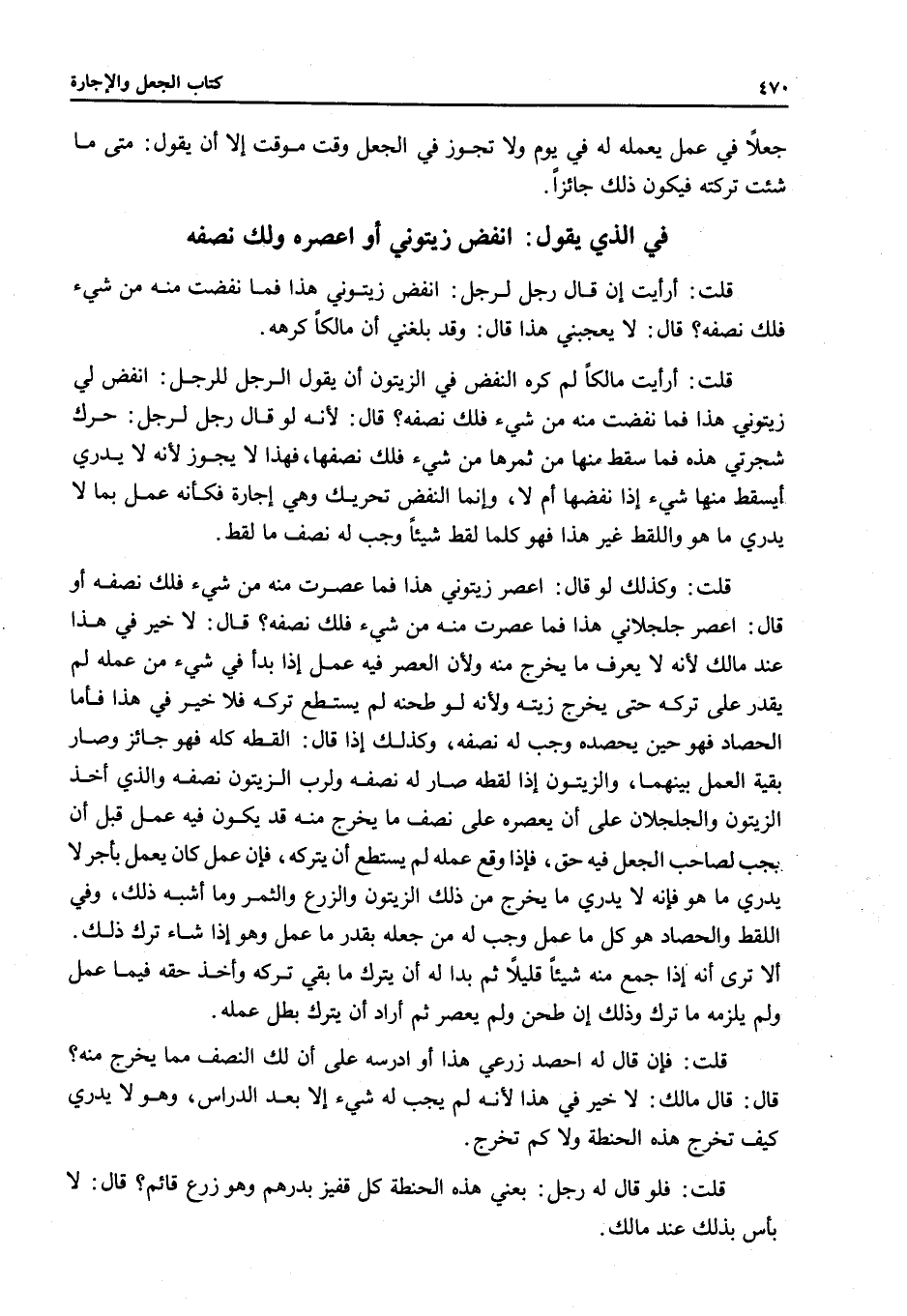 قُلْتُ: وَكَذَلِكَ لَوْ قَالَ: اعْصِرْ زَيْتُونِي هَذَا فَمَا عَصَرْتَ مِنْهُ مِنْ شَيْءٍ فَلَكَ نِصْفُهُ أَوْ قَالَ: اعْصِرْ جُلْجُلَانِي هَذَا فَمَا عَصَرْتَ مِنْهُ مِنْ شَيْءٍ فَلَكَ نِصْفُهُ؟ قَالَ: لَا خَيْرَ فِي هَذَا عِنْدَ مَالِكٍ؛ لِأَنَّهُ لَا يَعْرِفُ مَا يَخْرُجُ مِنْهُ وَلِأَنَّ الْعَصْرَ فِيهِ عَمَلٌ إذَا بَدَأَ فِي شَيْءٍ مِنْ عَمَلِهِ لَمْ يَقْدِرْ عَلَى تَرْكِهِ حَتَّى يَخْرُجَ زَيْتُهُ وَلِأَنَّهُ لَوْ طَحَنَهُ لَمْ يَسْتَطِعْ تَرْكَهُ فَلَا خَيْرَ فِي هَذَا فَأَمَّا الْحَصَادُ فَهُوَ حِينَ يَحْصُدُ وَجَبَ لَهُ نِصْفُهُ، وَكَذَلِكَ إذَا قَالَ: اُلْقُطْهُ كُلُّهُ فَهُوَ جَائِزٌ وَصَارَ بَقِيَّةُ الْعَمَلِ بَيْنَهُمَا، وَالزَّيْتُونُ إذَا لَقَطَهُ صَارَ لَهُ نِصْفُهُ وَلِرَبِّ الزَّيْتُونِ نِصْفُهُ وَاَلَّذِي أَخَذَ الزَّيْتُونَ وَالْجُلْجُلَانَ عَلَى أَنْ يَعْصِرَهُ عَلَى نِصْفِ مَا يَخْرُجُ مِنْهُ قَدْ يَكُونُ فِيهِ عَمَلٌ قَبْلَ أَنْ يَجِبَ لِصَاحِبِ الْجُعْلِ فِيهِ حَقٌّ، فَإِذَا وَقَعَ عَمَلُهُ لَمْ يَسْتَطِعْ أَنْ يَتْرُكَهُ، فَإِنْ عَمِلَ كَانَ يَعْمَلُ بِأَجْرٍ لَا يَدْرِي مَا هُوَ فَإِنَّهُ لَا يَدْرِي مَا يَخْرُجُ مِنْ ذَلِكَ الزَّيْتُونِ وَالزَّرْعِ وَالثَّمَرِ وَمَا أَشْبَهَ ذَلِكَ، وَفِي اللَّقْطِ وَالْحَصَادِ هُوَ كُلُّ مَا عَمِلَ وَجَبَ لَهُ مِنْ جُعْلِهِ بِقَدْرِ مَا عَمِلَ وَهُوَ إذَا شَاءَ تَرَكَ ذَلِكَ. أَلَا تَرَى أَنَّهُ إذَا جَمَعَ مِنْهُ شَيْئًا قَلِيلًا، ثُمَّ بَدَا لَهُ أَنْ يَتْرُكَ مَا بَقِيَ تَرَكَهُ وَأَخَذَ حَقَّهُ فِيمَا عَمِلَ وَلَمْ يَلْزَمْهُ مَا تَرَكَ وَذَلِكَ إنْ طَحَنَ وَلَمْ يَعْصِرْ، ثُمَّ أَرَادَ أَنْ يَتْرُكَ بَطَلَ عَمَلُهُ.