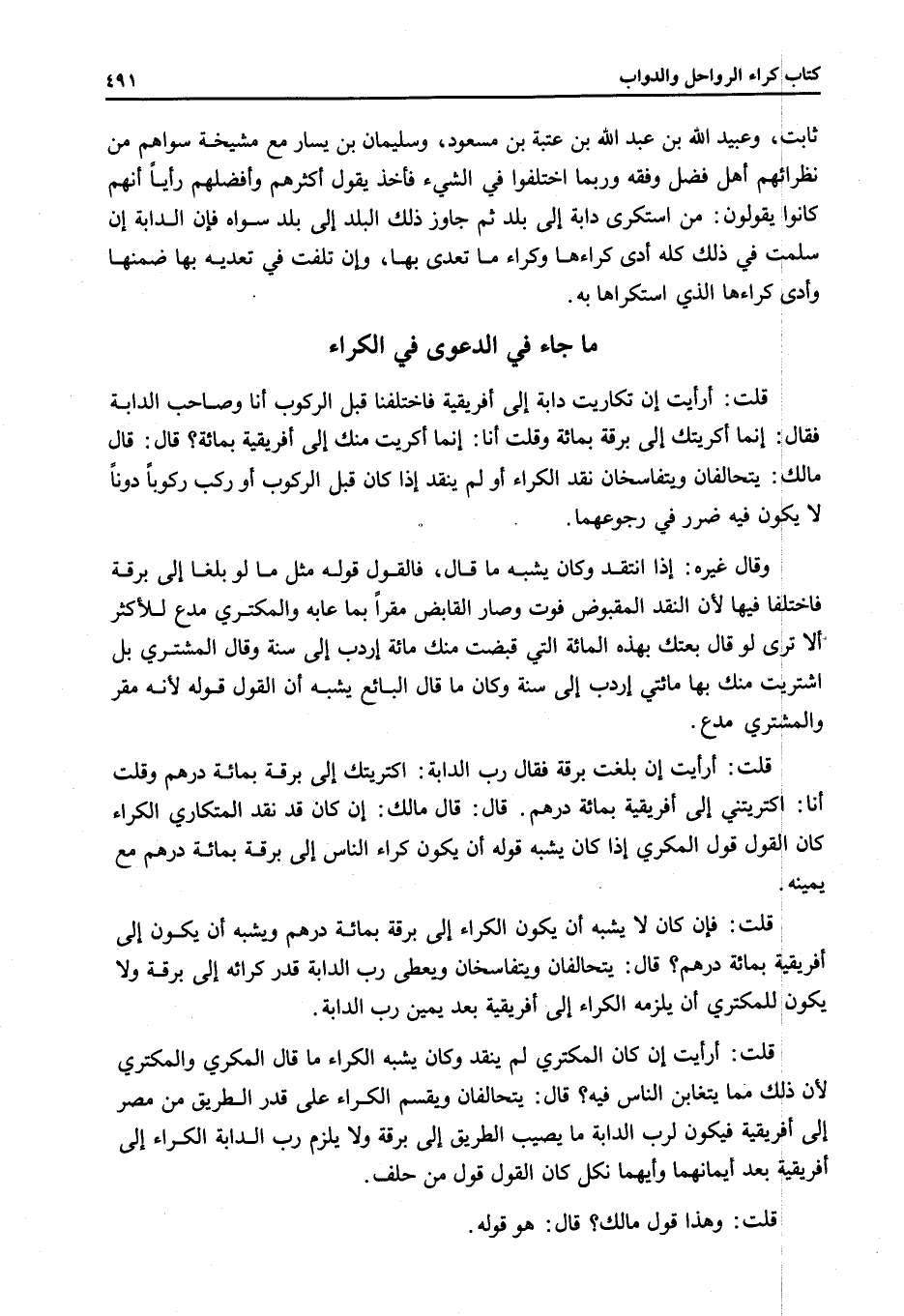 مَا جَاءَ فِي الدَّعْوَى فِي الْكِرَاءِ قُلْتُ: أَرَأَيْتَ إنْ تَكَارَيْتُ دَابَّةً إلَى إفْرِيقِيَّةَ فَاخْتَلَفْنَا قَبْلَ الرُّكُوبِ أَنَا وَصَاحِبُ الدَّابَّةِ فَقَالَ: إنَّمَا أَكْرَيْتُكَ إلَى بَرْقَةَ بِمِائَةٍ وَقُلْت أَنَا: إنَّمَا أَكْرَيْتُ مِنْكَ إلَى إفْرِيقِيَّةَ بِمِائَةٍ؟ قَالَ: قَالَ مَالِكٌ: يَتَحَالَفَانِ وَيَتَفَاسَخَانِ نُقِدَ الْكِرَاءُ أَوْ لَمْ يُنْقَدْ إذَا كَانَ قَبْلَ الرُّكُوبِ أَوْ رَكِبَ رُكُوبًا دُونًا لَا يَكُونُ فِيهِ ضَرَرٌ فِي رُجُوعِهِمَا، وَقَالَ غَيْرُهُ: إذَا انْتَقَدَ وَكَانَ يُشْبِهُ مَا قَالَ، فَالْقَوْلُ قَوْلُهُ مِثْلَ مَا لَوْ بَلَغَا إلَى بَرْقَةَ فَاخْتَلَفَا فِيهَا؛ لِأَنَّ النَّقْدَ الْمَقْبُوضَ فُوِّتَ وَصَارَ الْقَابِضُ مُقِرًّا بِمَا عَلَيْهِ وَالْمُكْتَرِي مُدَّعٍ لِلْأَكْثَرِ أَلَا تَرَى لَوْ قَالَ: بِعْتُكَ بِهَذِهِ الْمِائَةِ الَّتِي قَبَضْتُ مِنْكَ مِائَةَ إرْدَبٍّ إلَى سَنَةٍ وَقَالَ الْمُشْتَرِي بَلْ اشْتَرَيْتُ مِنْكَ بِهَا مِائَتَيْ إرْدَبٍّ إلَى سَنَةٍ وَكَانَ مَا قَالَ الْبَائِعُ يُشْبِهُ أَنَّ الْقَوْلَ قَوْلُهُ؛ لِأَنَّهُ مُقِرٌّ وَالْمُشْتَرِي مُدَّعٍ.