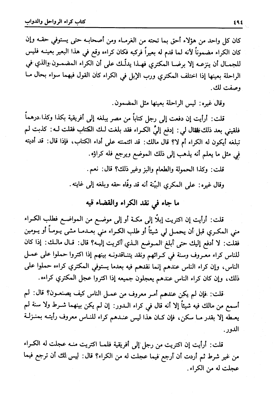 مَا جَاءَ فِي نَقْدِ الْكِرَاءِ وَالْقَضَاءِ فِيهِ قُلْتُ: أَرَأَيْتَ إنْ اكْتَرَيْت إبِلًا إلَى مَكَّةَ أَوْ إلَى مَوْضِعٍ مِنْ الْمَوَاضِعِ فَطَلَبَ الْكِرَاءَ مِنِّي الْمُكْرِي قَبْلَ أَنْ يَحْمِلَ لِي شَيْئًا أَوْ طَلَبَ الْكِرَاءَ مِنِّي بَعْد مَا مَشَى يَوْمًا أَوْ يَوْمَيْنِ فَقُلْتُ: لَا أَدْفَعُ إلَيْك حَتَّى أَبْلُغَ الْمَوْضِعَ الَّذِي أَكْرَيْتُ إلَيْهِ؟ قَالَ: قَالَ مَالِكٌ: إذَا كَانَ لِلنَّاسِ كِرَاءٌ مَعْرُوفٌ وَسُنَّةٌ فِي كِرَائِهِمْ وَنَقْدٌ يَتَنَاقَدُونَهُ بَيْنَهُمْ إذَا اكْتَرَوْا حَمَلُوا عَلَى عَمَلِ النَّاسِ، وَإِنَّ كِرَاءُ النَّاسِ عِنْدَهُمْ إنَّمَا نَقْدُهُمْ فِيهِ بَعْد مَا يَسْتَوْفِي الْمُكْتَرِي كِرَاءَهُ حَمَلُوا عَلَى ذَلِكَ، وَإِنْ كَانَ كِرَاءُ النَّاسِ عِنْدَهُمْ يُعَجِّلُونَ جَمِيعَهُ إذَا اكْتَرَوْا عَجَّلَ الْمُكْتَرِي كِرَاءَهُ.