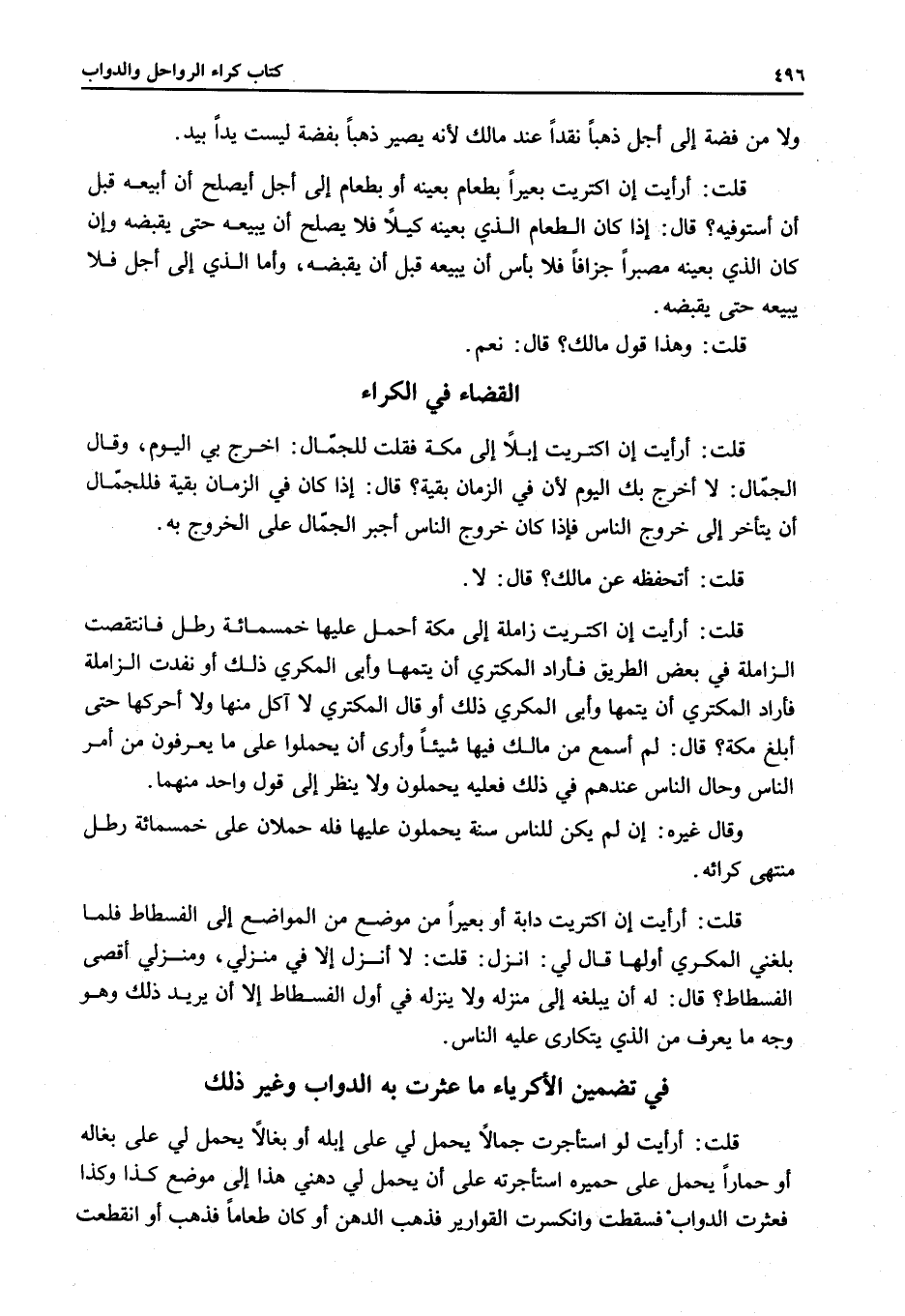ِ قُلْتُ: أَرَأَيْتَ إنْ اكْتَرَيْتُ إبِلًا إلَى مَكَّةَ فَقُلْتُ لِلْجَمَّالِ: اُخْرُجْ بِي الْيَوْمَ، وَقَالَ الْجَمَّالُ: لَا أَخْرُجُ بِكَ الْيَوْمَ؛ لِأَنَّ فِي الزَّمَانِ بَقِيَّةً؟