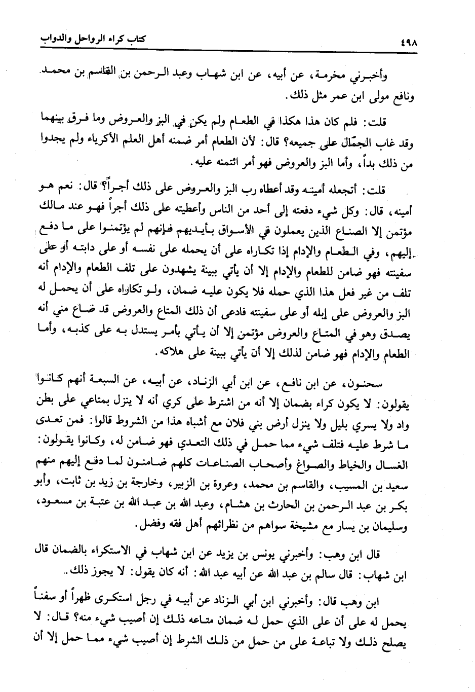 قَالَ ابْنُ وَهْبٍ: وَأَخْبَرَنِي يُونُسُ بْنُ يَزِيدَ عَنْ ابْنِ شِهَابٍ فِي الِاسْتِكْرَاءِ بِالضَّمَانِ قَالَ ابْنُ شِهَابٍ: قَالَ سَالِمُ بْنُ عَبْدِ اللَّهِ - عَنْ أَبِيهِ عَبْدِ اللَّهِ -: أَنَّهُ كَانَ يَقُولُ: لَا يُجَوِّزُ ذَلِكَ ابْنُ وَهْبٍ قَالَ: وَأَخْبَرَنِي ابْنُ أَبِي الزِّنَادِ عَنْ أَبِيهِ فِي رَجُلٍ اسْتَكْرَى ظَهْرًا أَوْ سُفُنًا يَحْمِلُ لَهُ عَلَى أَنَّ عَلَى الَّذِي حَمَلَ لَهُ ضَمَانُ مَتَاعِهِ ذَلِكَ إنْ أُصِيبَ شَيْءٌ مِنْهُ؟