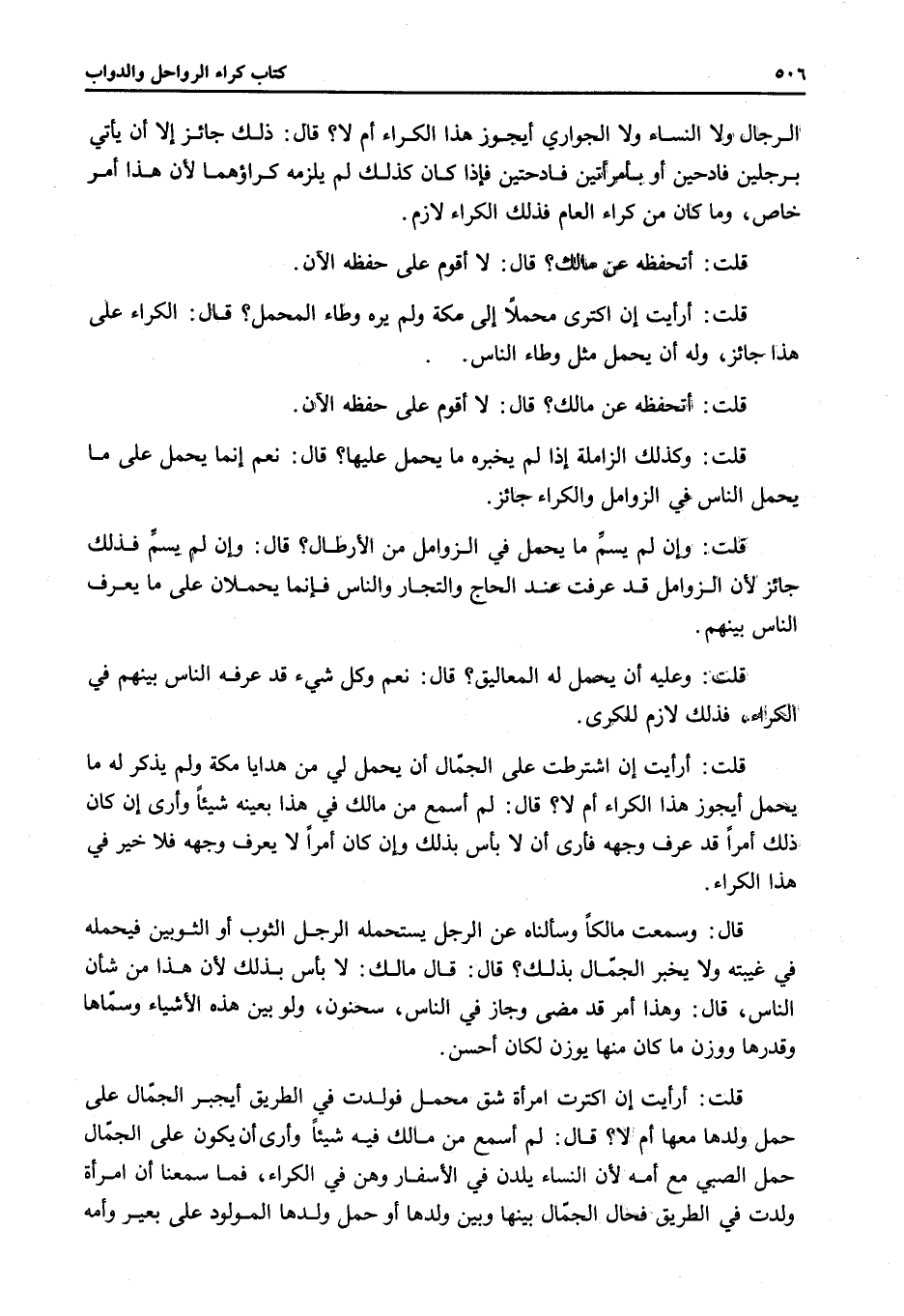 قُلْتُ: أَرَأَيْتَ إنْ اكْتَرَتْ امْرَأَةٌ شِقَّ مَحْمَلٍ فَوَلَدَتْ فِي الطَّرِيقِ أَيُجْبَرُ الْجَمَّالُ عَلَى حِمْلِ وَلَدِهَا مَعَهَا أَمْ لَا؟ قَالَ: لَمْ أَسْمَعْ مِنْ مَالِكٍ فِيهِ شَيْئًا، وَأَرَى أَنْ يَكُونَ عَلَى الْجَمَّالِ حِمْلُ الصَّبِيِّ مَعَ أُمِّهِ؛ لِأَنَّ النِّسَاءَ يَلِدْنَ فِي الْأَسْفَارِ وَهُنَّ فِي الْكِرَاءِ، فَمَا سَمِعْنَا أَنَّ امْرَأَةً وَلَدَتْ فِي الطَّرِيقِ فَحَال الْجَمَّالُ بَيْنَهَا وَبَيْنَ وَلَدِهَا أَوْ حَمَلَ وَلَدَهَا الْمَوْلُودَ عَلَى بَعِيرٍ وَأُمَّهُ