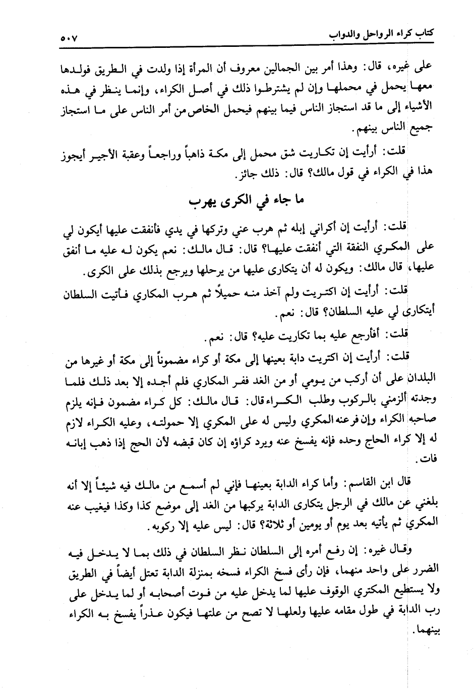 مَا جَاءَ فِي الْكَرِيِّ يَهْرُبُ قُلْتُ: أَرَأَيْتَ إنْ أَكْرَانِي إبِلَهُ ثُمَّ هَرَبَ عَنِّي وَتَرَكَهَا فِي يَدَيَّ فَأَنْفَقْتُ عَلَيْهَا أَيَكُونُ لِي عَلَى الْمُكْرِي النَّفَقَةُ الَّتِي أَنْفَقْت عَلَيْهَا؟ قَالَ: قَالَ مَالِكٌ: نَعَمْ يَكُونُ لَهُ عَلَيْهِ مَا أَنْفَقَ عَلَيْهَا، قَالَ مَالِكٌ: وَيَكُونُ لَهُ أَنْ يَتَكَارَى عَلَيْهَا مَنْ يُرَحِّلُهَا وَيَرْجِعُ بِذَلِكَ عَلَى الْكَرِيِّ. قُلْتُ: أَرَأَيْتَ إنْ اكْتَرَيْتُ وَلَمْ آخُذْ مِنْهُ حَمِيلًا ثُمَّ هَرَبَ الْمُكَارِي فَأَتَيْتُ السُّلْطَانَ أَيَتَكَارَى لِي عَلَيْهِ السُّلْطَانُ؟