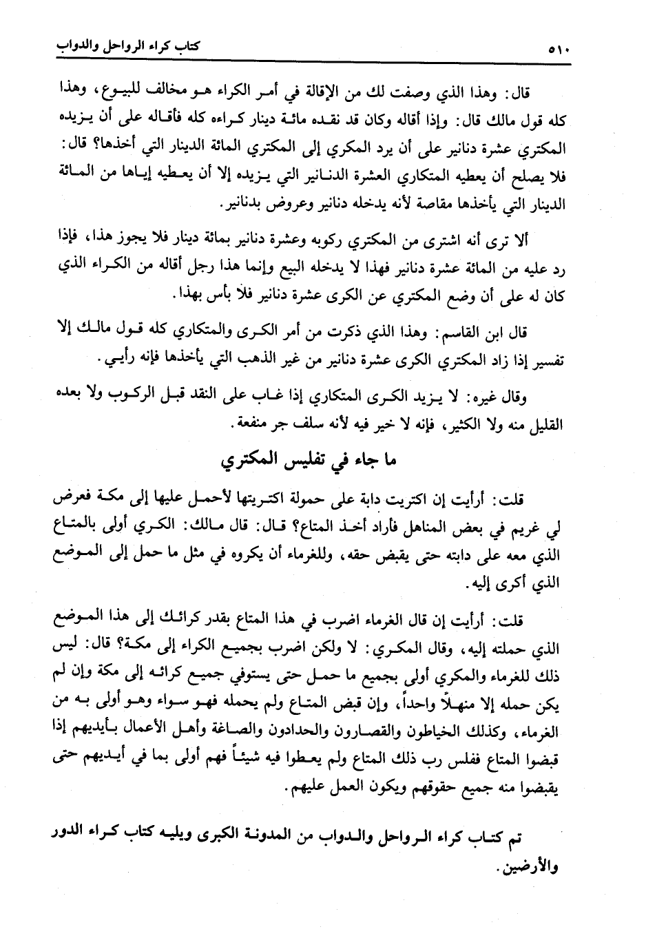 مَا جَاءَ فِي تَفْلِيسِ الْمُكْتَرِي قُلْتُ: أَرَأَيْتَ إنْ اكْتَرَيْتُ دَابَّةً عَلَى حُمُولَةٍ اكْتَرَيْتُهَا لِأَحْمِلَ عَلَيْهَا إلَى مَكَّةَ فَعَرَضَ لِي غَرِيمٌ فِي بَعْضِ الْمَنَاهِلِ فَأَرَادَ أَخْذَ الْمَتَاعِ؟