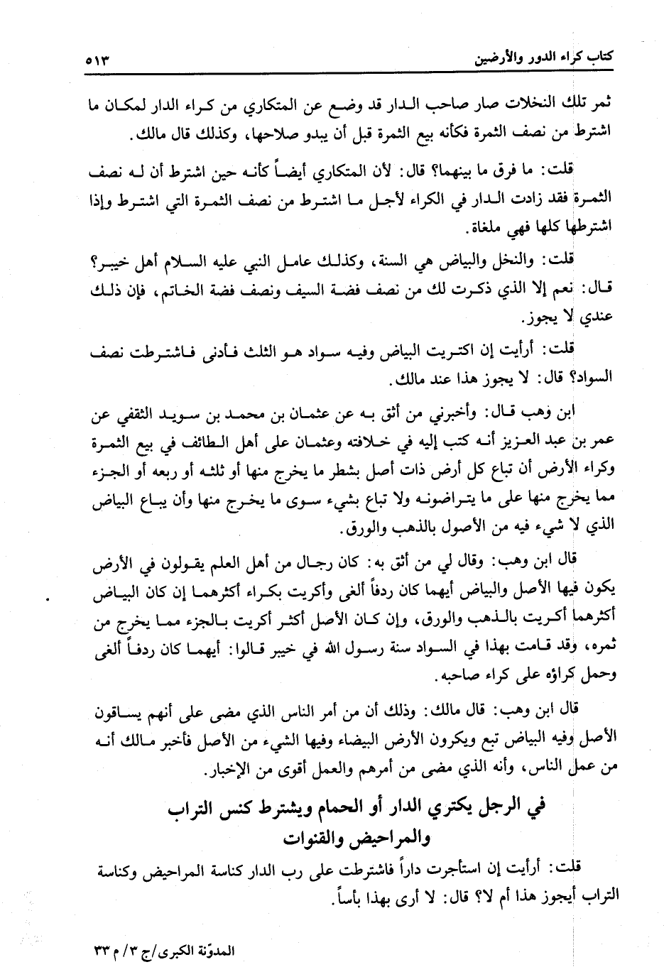 قُلْتُ: أَرَأَيْتَ إنْ اكْتَرَيْت الْبَيَاضَ وَفِيهِ سَوَادٌ هُوَ الثُّلُثُ فَأَدْنَى فَاشْتَرَطْتُ نِصْفَ السَّوَادِ؟ قَالَ: لَا يَجُوزُ هَذَا عِنْدَ مَالِكٍ ابْنُ وَهْبٍ قَالَ: وَأَخْبَرَنِي مَنْ أَثِقُ بِهِ عَنْ عُثْمَانَ بْنِ مُحَمَّدِ بْنِ سُوَيْدٍ الثَّقَفِيِّ عَنْ عُمَرَ بْنِ عَبْدِ الْعَزِيزِ أَنَّهُ كَتَبَ إلَيْهِ فِي خِلَافَتِهِ وَعُثْمَانُ عَلَى أَهْلِ الطَّائِفِ فِي بَيْعِ الثَّمَرَةِ وَكِرَاءِ الْأَرْضِ أَنْ تُبَاعَ كُلُّ أَرْضٍ ذَاتِ أَصْلٍ بِشَطْرِ مَا يَخْرُجُ مِنْهَا أَوْ ثُلُثِهِ أَوْ رُبْعِهِ أَوْ الْجُزْءِ مِمَّا يَخْرُجُ مِنْهَا عَلَى مَا يَتَرَاضَوْنَهُ وَلَا تُبَاعُ بِشَيْءٍ سِوَى مَا يَخْرُجُ مِنْهَا وَأَنْ يُبَاعَ الْبَيَاضُ الَّذِي لَا شَيْءَ فِيهِ مِنْ الْأُصُولِ بِالذَّهَبِ وَالْوَرِقِ.
