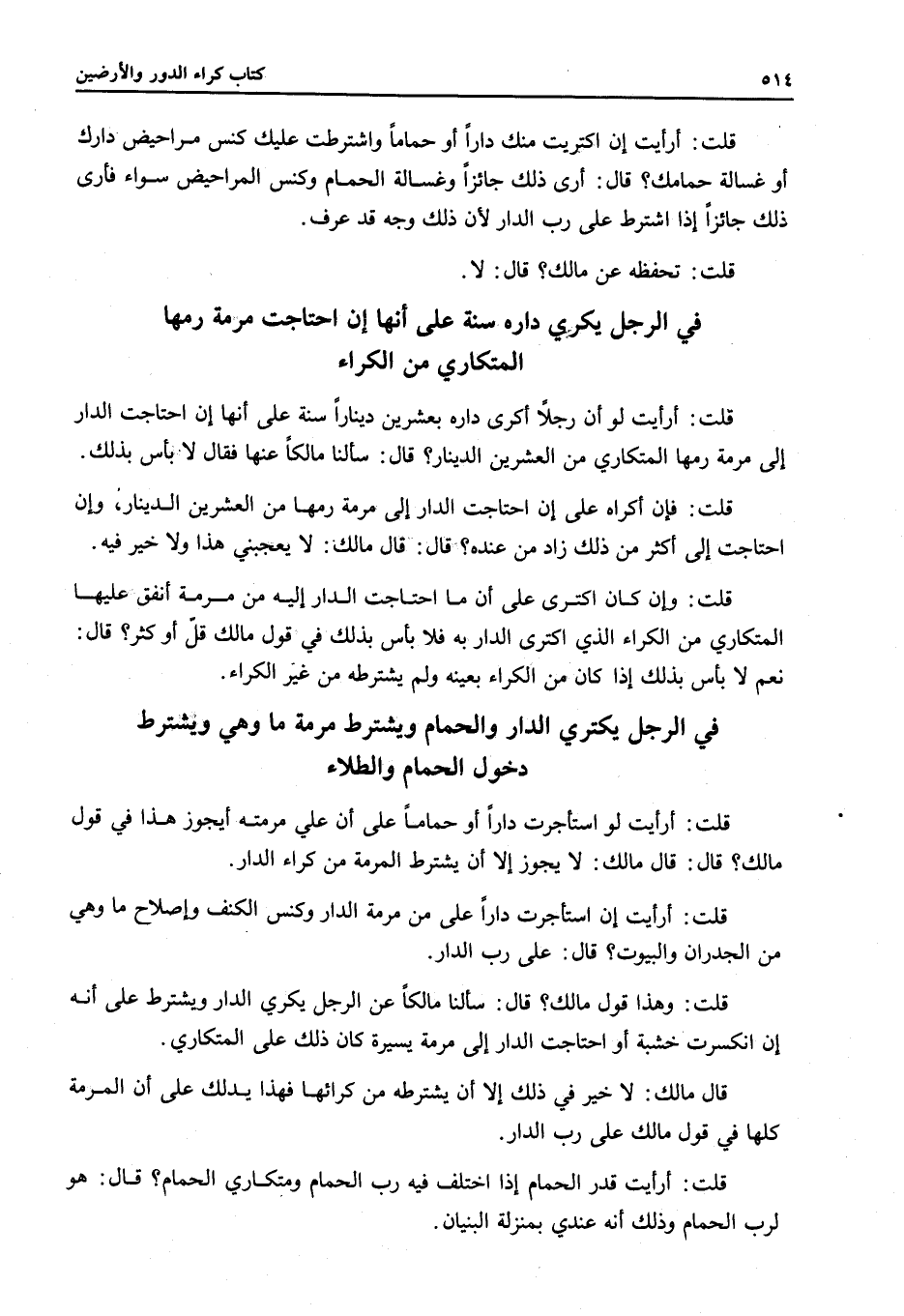 قُلْتُ: أَرَأَيْتَ إنْ اكْتَرَيْتُ مِنْكَ دَارًا أَوْ حَمَّامًا وَاشْتَرَطْتُ عَلَيْكَ كَنْسَ مَرَاحِيضِ دَارِكَ أَوْ غُسَالَةَ حَمَّامِكَ؟