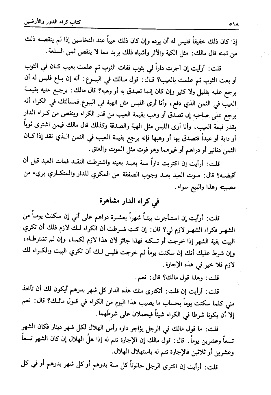 قُلْتُ: أَرَأَيْتَ إنْ قُلْتُ: أَتَكَارَى مِنْكَ هَذِهِ الدَّارَ كُلَّ شَهْرٍ بِدِرْهَمٍ أَيَكُونُ لَكَ أَنْ تَأْخُذَ مِنِّي كُلَّمَا سَكَنْتُ يَوْمًا بِحِسَابِ مَا يُصِيبُ هَذَا الْيَوْمَ مِنْ الْكِرَاءِ فِي قَوْلِ مَالِكٍ؟