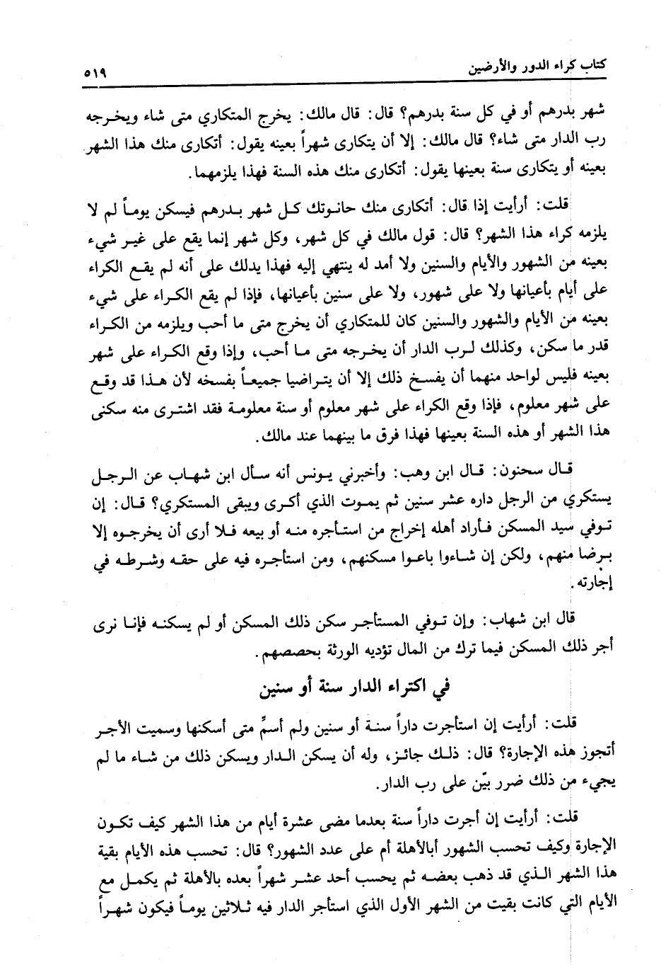 فِي اكْتِرَاءِ الدَّارِ سَنَةً أَوْ سِنِينَ قُلْتُ: أَرَأَيْتَ إنْ اسْتَأْجَرْت دَارًا سَنَةً أَوْ سِنِينَ، وَلَمْ أُسَمِّ مَتَى أَسْكُنُهَا وَسَمَّيْت الْأَجْرَ أَتَجُوزُ هَذِهِ الْإِجَارَةُ؟ قَالَ: ذَلِكَ جَائِزٌ، وَلَهُ أَنْ يَسْكُنَ الدَّارَ وَيُسْكِنَ ذَلِكَ مَنْ شَاءَ مَا لَمْ يَجِئْ مِنْ ذَلِكَ ضَرَرٌ بَيِّنٌ عَلَى رَبِّ الدَّارِ. قُلْتُ: أَرَأَيْتَ إنْ أَجَرْت دَارًا سَنَةً بَعْدَ مَا مَضَى عَشَرَةُ أَيَّامٍ مِنْ هَذَا الشَّهْرِ كَيْفَ تَكُونُ الْإِجَارَةُ، وَكَيْفَ تُحْسَبُ الشُّهُورُ أَبِالْأَهِلَّةِ أَمْ عَلَى عَدَدِ الشُّهُورِ؟ قَالَ: تُحْسَبُ هَذِهِ الْأَيَّامُ بَقِيَّةَ هَذَا الشَّهْرِ الَّذِي قَدْ ذَهَبَ بَعْضُهُ ثُمَّ يُحْسَبُ أَحَدَ عَشَرَ شَهْرًا بَعْدَهُ بِالْأَهِلَّةِ ثُمَّ يُكْمِلُ مَعَ الْأَيَّامِ الَّتِي كَانَتْ بَقِيَتْ مِنْ الشَّهْرِ الْأَوَّلِ الَّذِي اسْتَأْجَرَ الدَّارَ فِيهِ ثَلَاثِينَ يَوْمًا فَيَكُونُ شَهْرًا