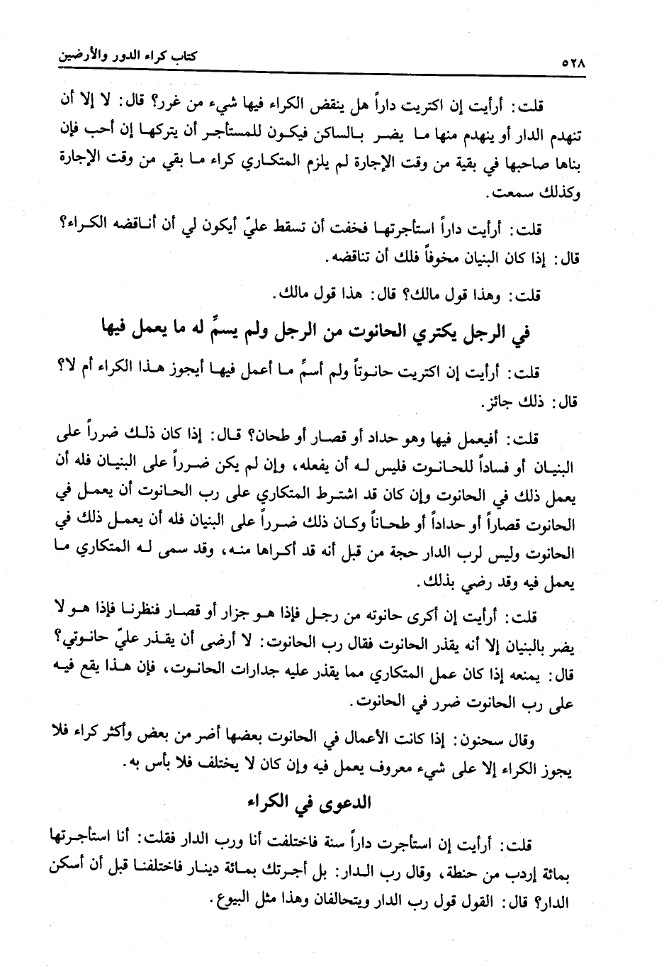 قُلْتُ: أَرَأَيْتَ إنْ أَكْرَى حَانُوتَهُ مِنْ رَجُلٍ فَإِذَا هُوَ جَزَّارٌ أَوْ قَصَّارٌ فَنَظَرْنَا فَإِذَا هُوَ لَا يَضُرُّ بِالْبُنْيَانِ إلَّا أَنَّهُ يَقْذُرُ الْحَانُوتُ فَقَالَ رَبُّ الْحَانُوتِ: لَا أَرْضَى أَنْ يَقْذُرَ عَلَيَّ حَانُوتِي؟ قَالَ: يَمْنَعُهُ إذَا كَانَ عَمَلُ الْمُتَكَارِي مِمَّا يَقْذُرُ عَلَيْهِ جِدَارَاتِ الْحَانُوتِ، فَإِنَّ هَذَا يَقَعُ فِيهِ عَلَى رَبِّ الْحَانُوتِ ضَرَرٌ فِي الْحَانُوتِ. وَقَالَ سَحْنُونٌ: إذَا كَانَتْ الْأَعْمَالُ فِي الْحَانُوتِ بَعْضُهَا أَضَرُّ مِنْ بَعْضٍ وَأَكْثَرُ كِرَاءً فَلَا يَجُوزُ الْكِرَاءُ إلَّا عَلَى شَيْءٍ مَعْرُوفٍ يَعْمَلُ فِيهِ وَإِنْ كَانَ لَا يَخْتَلِفُ فَلَا بَأْسَ بِهِ.