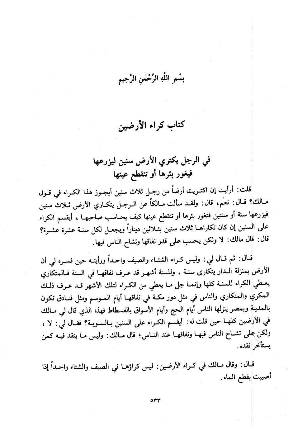 قَالَ: قَالَ مَالِكٌ: لَا وَلَكِنْ يَحْسِبُ عَلَى قَدْرِ نِفَاقِهَا وَتَشَاحِّ النَّاسِ فِيهَا. قَالَ: ثُمَّ قَالَ لِي: وَلَيْسَ كِرَاءُ الشِّتَاءِ وَالصَّيْفِ وَاحِدًا وَرَأَيْتُهُ حِينَ فَسَّرَهُ لِي أَنَّ الْأَرْضَ بِمَنْزِلَةِ الدَّارِ يَتَكَارَى سَنَةً، وَلِلسَّنَةِ أَشْهُرٌ قَدْ عَرَفَ نِفَاقَهَا فِي السَّنَةِ فَالْمُتَكَارِي يُعْطِي الْكِرَاءَ لِلسَّنَةِ كُلِّهَا وَإِنَّمَا جُلُّ مَا يُعْطِي مِنْ الْكِرَاءِ لِتِلْكَ الْأَشْهُرِ قَدْ عَرَفَ ذَلِكَ الْمُكْرِي وَالْمُتَكَارِي وَالنَّاسُ فِي مِثْلِ دُورِ مَكَّةَ فِي نِفَاقِهَا أَيَّامَ الْمَوْسِمِ وَمِثْلِ فَنَادِقَ تَكُونُ بِالْمَدِينَةِ وَبِمِصْرِ يَنْزِلُهَا النَّاسُ أَيَّامَ الْحَجِّ وَأَيَّامَ الْأَسْوَاقِ بِالْفُسْطَاطِ فَهَذَا الَّذِي قَالَ لِي مَالِكٌ فِي الْأَرَضِينَ كُلِّهَا حِينَ قُلْتُ لَهُ: أَيَقْسِمُ الْكِرَاءَ عَلَى السِّنِينَ بِالسَّوِيَّةِ؟ فَقَالَ لِي: لَا، وَلَكِنْ عَلَى تَشَاحِّ النَّاسِ فِيهَا وَنِفَاقِهَا عِنْدَ النَّاسِ؛ قَالَ مَالِكٌ: وَلَيْسَ مَا يُنْقَدُ فِيهِ كَمَنْ يُسْتَأْخَرُ نَقْدُهُ.
