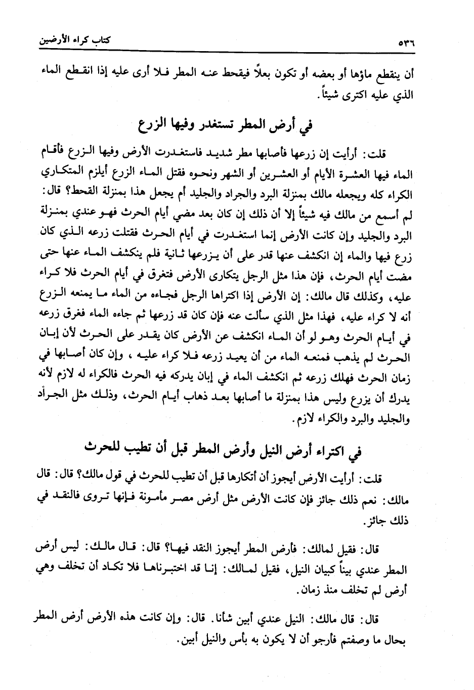 قَالَ: قَالَ مَالِكٌ: لَيْسَ أَرْضُ الْمَطَرِ عِنْدِي بَيِّنًا كَبَيَانِ النِّيلِ، فَقِيلَ لِمَالِكٍ: إنَّا قَدْ اخْتَبَرْنَاهَا فَلَا تَكَادُ أَنْ تُخْلِفَ وَهِيَ أَرْضٌ لَمْ تُخْلِفْ مُنْذُ زَمَانٍ.