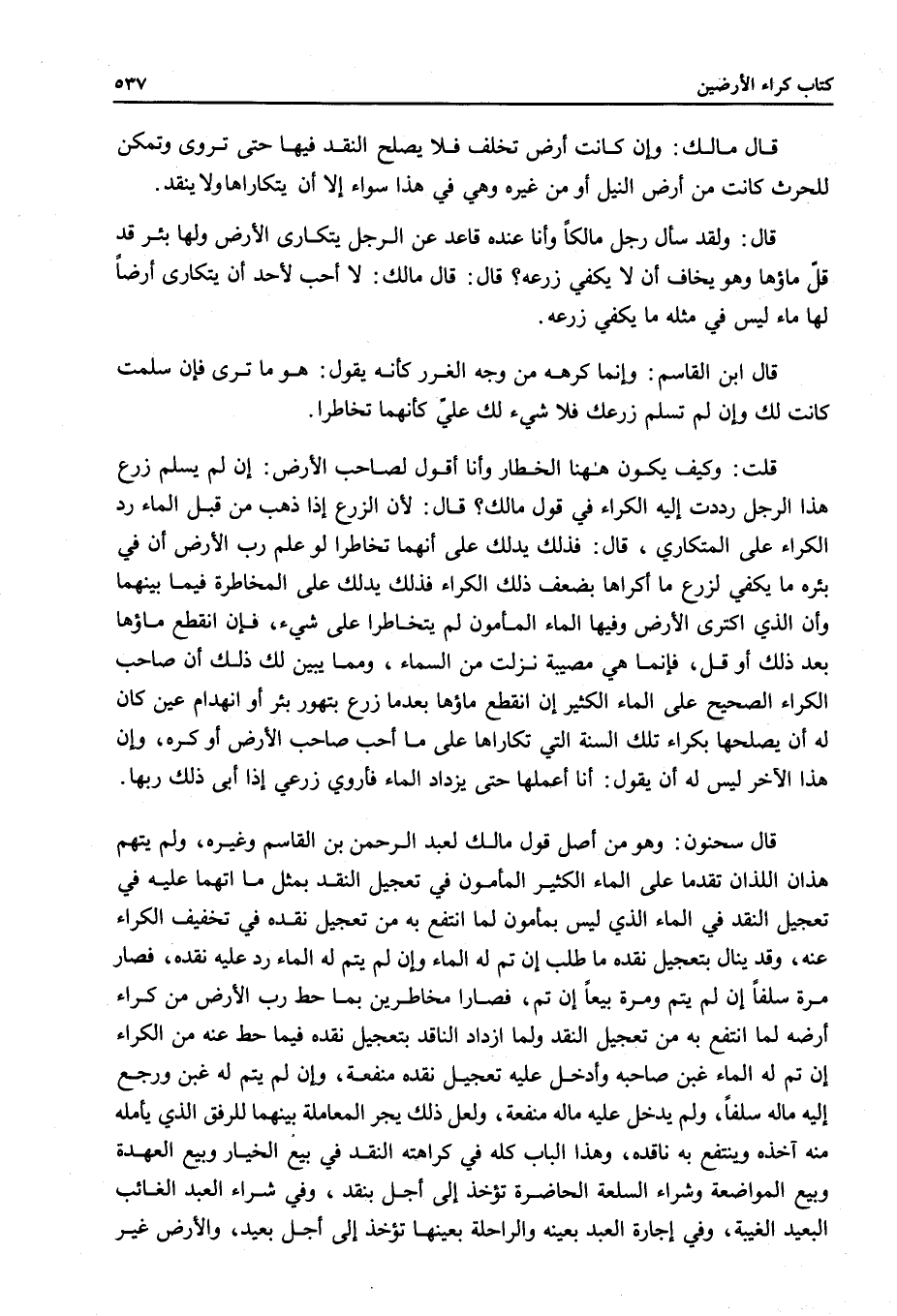 قَالَ سَحْنُونٌ: وَهُوَ مِنْ أَصْلِ قَوْلِ مَالِكٍ لِعَبْدِ الرَّحْمَنِ بْنِ الْقَاسِمِ وَغَيْرِهِ، وَلَمْ يُتَّهَمْ هَذَانِ اللَّذَانِ تَقَدَّمَا عَلَى الْمَاءِ الْكَثِيرِ الْمَأْمُونِ فِي تَعْجِيلِ النَّقْدِ بِمِثْلِ مَا اُتُّهِمَا عَلَيْهِ فِي تَعْجِيلِ النَّقْدِ فِي الْمَاءِ الَّذِي لَيْسَ بِمَأْمُونٍ لِمَا انْتَفَعَ بِهِ مِنْ تَعْجِيلِ نَقْدِهِ فِي تَخْفِيفِ الْكِرَاءِ عَنْهُ، وَقَدْ يَنَالُ بِتَعْجِيلِ نَقْدِهِ مَا طَلَبَ إنْ تَمَّ لَهُ الْمَاءُ وَإِنْ لَمْ يُتِمَّ لَهُ الْمَاءَ رَدَّ عَلَيْهِ نَقْدَهُ، فَصَارَ مَرَّةً سَلَفًا إنْ لَمْ يُتِمَّ وَمَرَّةً بَيْعًا إنْ تَمَّ فَصَارَا مُخَاطِرَيْنِ بِمَا حَطَّ رَبُّ الْأَرْضِ مِنْ كِرَاءِ أَرْضِهِ لِمَا انْتَفَعَ بِهِ مِنْ تَعْجِيلِ النَّقْدِ وَلِمَا ازْدَادَ النَّاقِدُ بِتَعْجِيلِ نَقْدِهِ فِيمَا حُطَّ عَنْهُ مِنْ الْكِرَاءِ إنْ تَمَّ لَهُ الْمَاءُ غَبَنَ صَاحِبَهُ وَأَدْخَلَ عَلَيْهِ تَعْجِيلَ نَقْدِهِ مَنْفَعَةً.