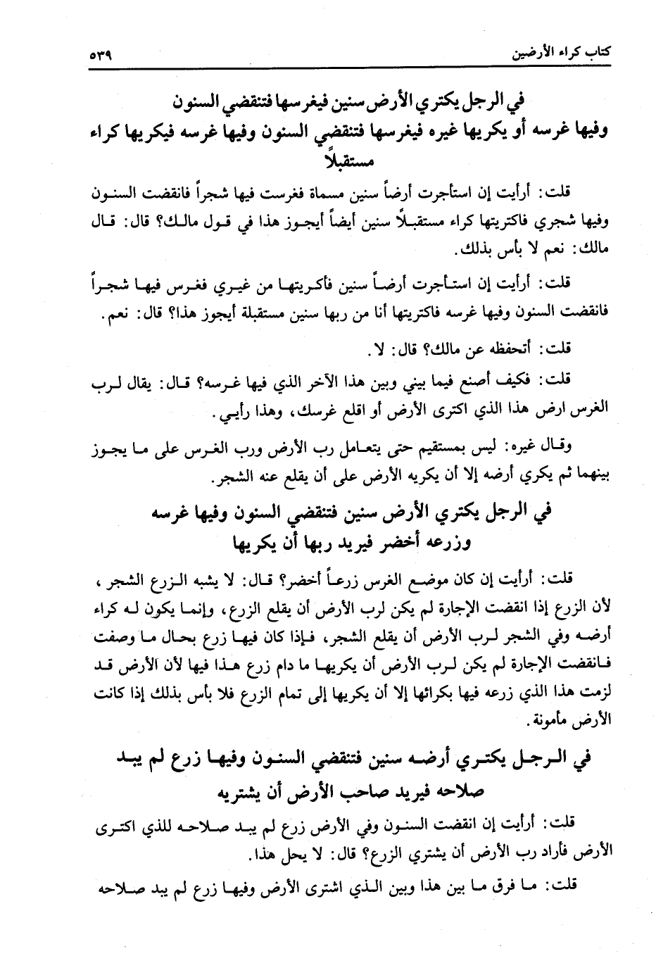 قُلْتُ: أَرَأَيْتَ إنْ اسْتَأْجَرْت أَرْضًا سِنِينَ فَأَكْرَيْتُهَا مِنْ غَيْرِي فَغَرَسَ فِيهَا شَجَرًا فَانْقَضَتْ السُّنُونَ وَفِيهَا غَرْسُهُ فَاكْتَرَيْتُهَا أَنَا مِنْ رَبِّهَا سِنِينَ مُسْتَقْبَلَةً أَيَجُوزُ هَذَا؟