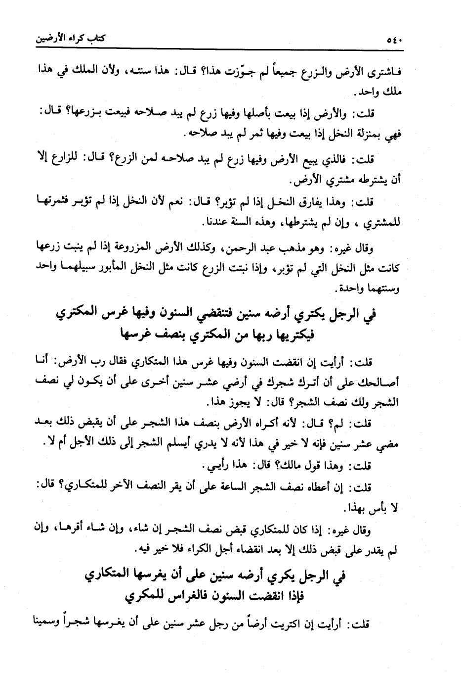 فِي الرَّجُلِ يَكْتَرِي أَرْضَهُ سِنِينَ فَتَنْقَضِي السُّنُونَ وَفِيهَا غَرْسُ الْمُكْتَرِي فَيَكْتَرِيهَا رَبُّهَا مِنْ الْمُكْتَرِي بِنِصْفِ غَرْسِهَا قُلْتُ: أَرَأَيْتَ إنْ انْقَضَتْ السُّنُونَ، وَفِيهَا غَرْسُ هَذَا الْمُتَكَارِي فَقَالَ رَبُّ الْأَرْضِ: أَنَا أَصَالِحُك عَلَى أَنْ أَتْرُكَ شَجَرَكَ فِي أَرْضِي عَشْرَ سِنِينَ أُخْرَى عَلَى أَنْ يَكُونَ لِي نِصْفُ الشَّجَرِ وَلَك نِصْفُ الشَّجَرِ؟
