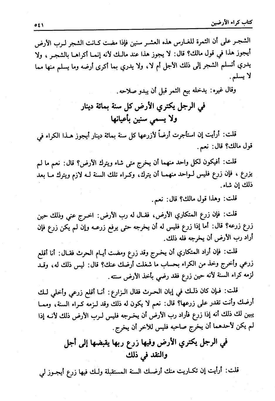 فِي الرَّجُلِ يَكْتَرِي الْأَرْضَ وَفِيهَا زَرْعُ رَبِّهَا يَقْبِضُهَا إلَى أَجَلٍ، وَالنَّقْدِ فِي ذَلِكَ قُلْتُ: أَرَأَيْتَ إنْ تَكَارَيْتُ مِنْكَ أَرْضَكَ السَّنَةَ الْمُسْتَقْبَلَةَ، وَلَك فِيهَا زَرْعٌ أَيَجُوزُ لِي