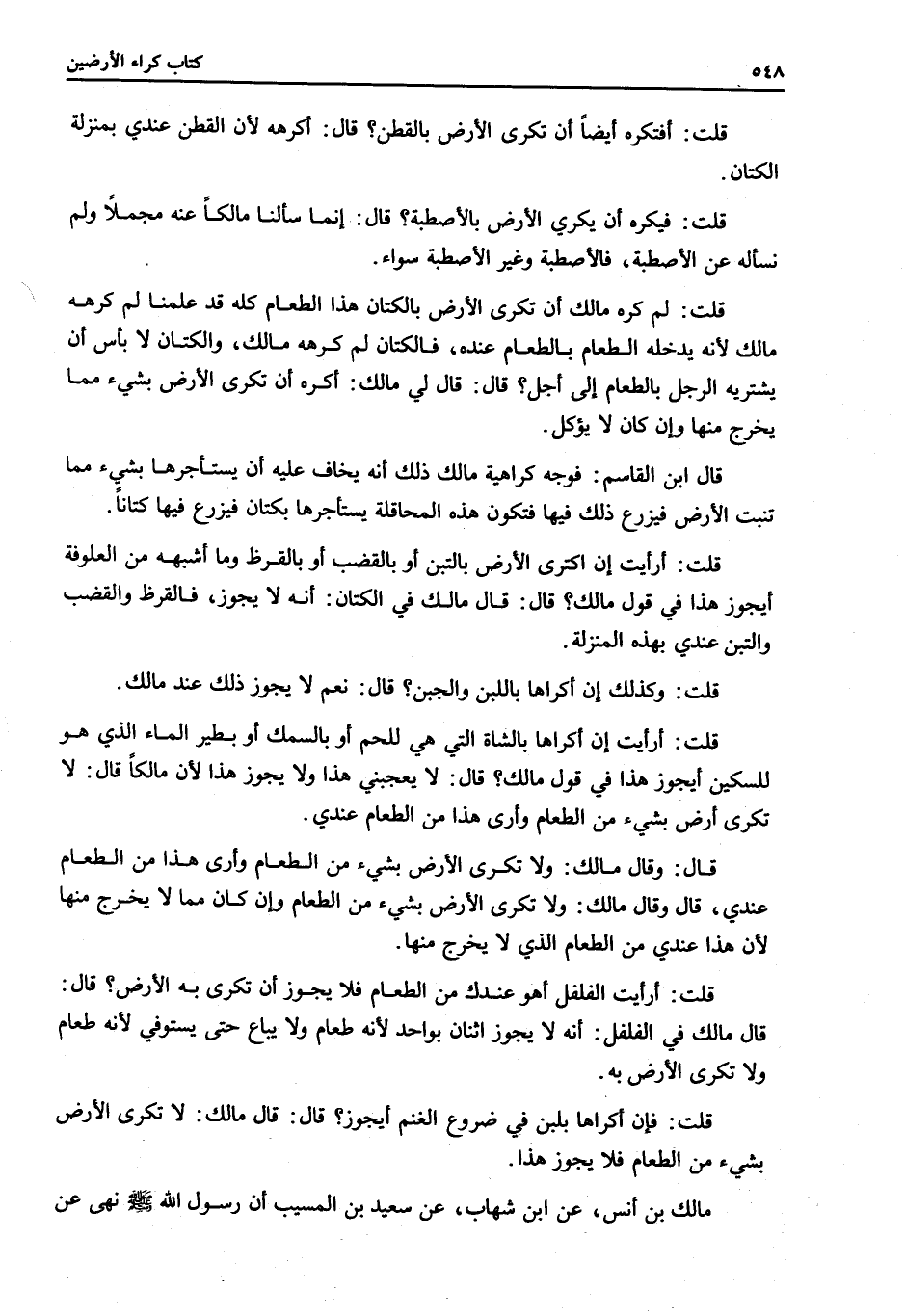 قَالَ: قَالَ مَالِكٌ: لَا تُكْرَى الْأَرْضُ بِشَيْءٍ مِنْ الطَّعَامِ فَلَا يَجُوزُ هَذَا. مَالِكُ بْنُ أَنَسٍ، عَنْ ابْنِ شِهَابٍ، عَنْ سَعِيدِ بْنِ الْمُسَيِّبِ أَنَّ رَسُولَ اللَّهِ - صَلَّى اللَّهُ عَلَيْهِ وَسَلَّمَ - «نَهَى عَنْ