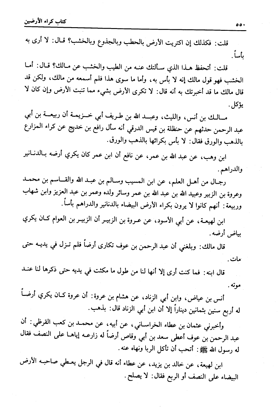 قَالَ مَالِكٌ: وَبَلَغَنِي أَنَّ عَبْدَ الرَّحْمَنِ بْنَ عَوْفٍ تَكَارَى أَرْضًا فَلَمْ تَزَلْ فِي يَدَيْهِ حَتَّى مَاتَ. قَالَ ابْنُهُ: فَمَا كُنْتُ أَرَى إلَّا أَنَّهَا لَنَا مِنْ طُولِ مَا مَكَثَتْ فِي يَدَيْهِ حَتَّى ذَكَرَهَا لَنَا عِنْدَ مَوْتِهِ. أَنَسُ بْنُ عِيَاضٍ، وَابْنُ أَبِي الزِّنَادِ، عَنْ هِشَامِ بْنِ عُرْوَةَ: أَنَّ عُرْوَةَ كَانَ يُكْرِي أَرْضًا لَهُ أَرْبَعَ سِنِينَ بِثَمَانِينَ دِينَارًا؛ إلَّا أَنْ ابْنَ أَبِي الزِّنَادِ قَالَ: بِذَهَبٍ. وَأَخْبَرَنِي عُثْمَانُ بْنُ عَطَاءٍ الْخُرَاسَانِيُّ، عَنْ أَبِيهِ، عَنْ مُحَمَّدِ بْنِ كَعْبٍ الْقُرَظِيِّ: «أَنَّ عَبْدَ الرَّحْمَنِ بْنَ عَوْفٍ أَعْطَى سَعْدَ بْنَ أَبِي وَقَّاصٍ أَرْضًا لَهُ زَارَعَهُ إيَّاهَا عَلَى النِّصْفِ فَقَالَ لَهُ رَسُولُ اللَّهِ - صَلَّى اللَّهُ عَلَيْهِ وَسَلَّمَ -: أَتُحِبُّ أَنْ تَأْكُلَ الرِّبَا وَنَهَاهُ عَنْهُ» . ابْنُ لَهِيعَةَ، عَنْ خَالِدِ بْنِ يَزِيدَ، عَنْ عَطَاءٍ أَنَّهُ قَالَ فِي الرَّجُلِ يُعْطِي صَاحِبَهُ الْأَرْضَ الْبَيْضَاءَ عَلَى النِّصْفِ أَوْ الرُّبْعِ فَقَالَ: لَا يَصْلُحُ.