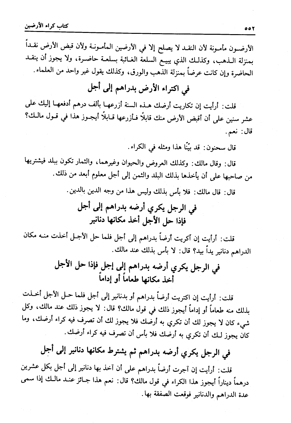 فِي اكْتِرَاءِ الْأَرْضِ بِدَرَاهِمَ إلَى أَجَلٍ قُلْتُ: أَرَأَيْتَ إنْ تَكَارَيْتُ أَرْضَكَ هَذِهِ السَّنَةَ أَزْرَعُهَا بِأَلْفِ دِرْهَمٍ أَدْفَعُهَا إلَيْك عَلَى عَشْرِ سِنِينَ عَلَى أَنْ أَقْبِضَ الْأَرْضَ مِنْكَ قَابِلًا فَأَزْرَعُهَا قَابِلًا أَيَجُوزُ هَذَا فِي قَوْلِ مَالِكٍ؟