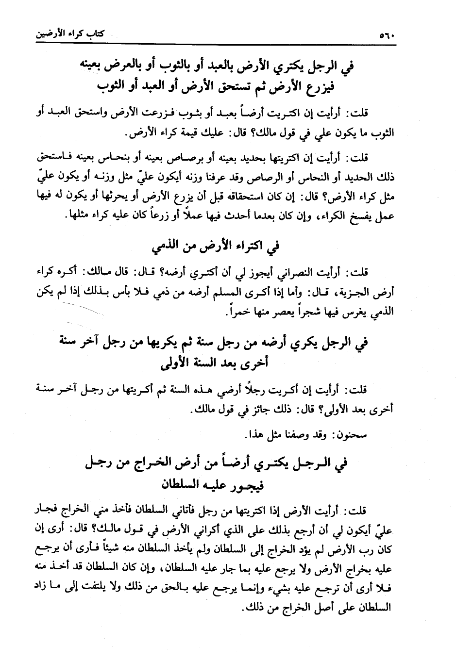 فِي الرَّجُلِ يَكْتَرِي أَرْضًا مِنْ أَرْضِ الْخَرَاجِ مِنْ رَجُلٍ فَيَجُورُ عَلَيْهِ السُّلْطَانُ قُلْتُ: أَرَأَيْتَ الْأَرْضَ إذَا اكْتَرَيْتهَا مِنْ رَجُلٍ فَأَتَانِي السُّلْطَانُ فَأَخَذَ مِنِّي الْخَرَاجَ فَجَار عَلَيَّ أَيَكُونُ لِي أَنْ أَرْجِعَ بِذَلِكَ عَلَى الَّذِي أَكْرَانِي الْأَرْضَ فِي قَوْلِ مَالِكٍ؟