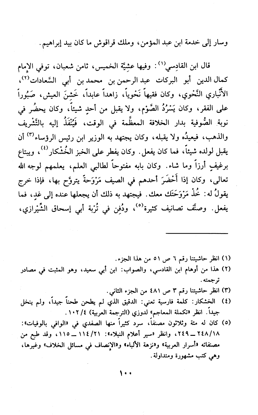 قَالَ ابْن القادسي وفيهَا عَشِيَّة الْخَمِيس ثامن شعْبَان توفّي الإِمَام كَمَال الدّين أَبُو البركات عبد الرَّحْمَن بن مُحَمَّد بن أبي السعادات الْأَنْبَارِي النَّحْوِيّ وَكَانَ فَقِيها نحويا زاهدا عابدا خشن الْعَيْش صبورا على الْفقر وَكَانَ يسْرد الصَّوْم وَلَا يقبل من أحد شَيْئا وَكَانَ يحضر فِي نوبَة الصُّوفِيَّة بدار الْخلَافَة المعظمة فِي الْوَقْت فَينفذ إِلَيْهِ بالتشريف وَالذَّهَب فيعيده وَلَا يقبله وَكَانَ يجْتَهد بِهِ الْوَزير ابْن رَئِيس الرؤساء أَن يقبل لوَلَده شَيْئا فَمَا كَانَ يفعل
