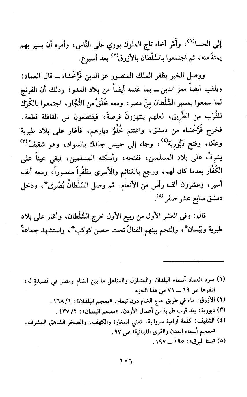 قَالَ وَفِي الْعشْر الأول من ربيع الأول خرج السُّلْطَان وأغار على بِلَاد طبرية وبيسان والتحم بَينهم الْقِتَال تَحت حصن كَوْكَب وَاسْتشْهدَ جمَاعَة