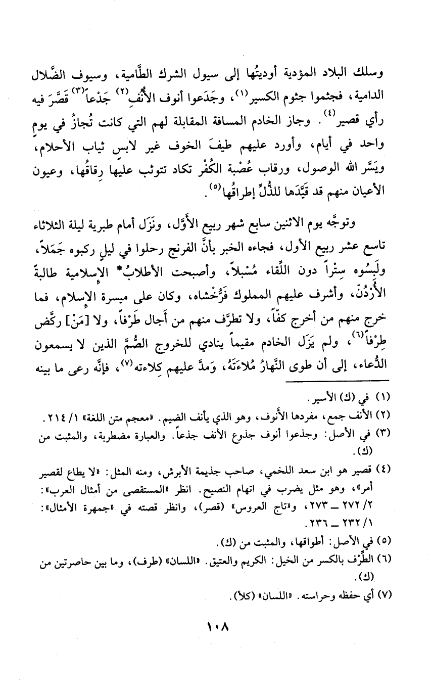 وسلك الْبِلَاد المؤدية أَوديتهَا إِلَى سيول الشّرك الطامية وسيوف الضلال الدامية فجثموا جثوم الكسير وجدعوا أنوف الْأنف جدعا قصر فِيهِ رَأْي قصير