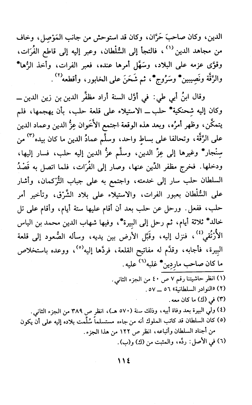وَقَالَ ابْن أبي طي فِي أول السّنة أَرَادَ مظفر الدّين بن زين الدّين وَكَانَ إِلَيْهِ شحنكية حلب الِاسْتِيلَاء على قلعة حلب بِأَن يهجمها فَلم يتَمَكَّن وَظهر أمره وَبعد هَذِه الْوَقْعَة اجْتمع الأخوان عز الدّين وعماد الدّين على الرقة وتحالفا على بِسَاط وَاحِد وَسلم عماد الدّين مَا كَانَ بِيَدِهِ من سنجار وَغَيرهَا إِلَى عز الدّين وَسلم عز الدّين إِلَيْهِ حلب فَسَار إِلَيْهَا ودخلها فَخرج مظفر الدّين عَنْهَا وَصَارَ إِلَى الْفُرَات فَلَمَّا اتَّصل بِهِ قصد السُّلْطَان حلب سَار إِلَى خدمته وَاجْتمعَ بِهِ على جباب التركمان وَأَشَارَ على السُّلْطَان بعبور الْفُرَات والاستيلاء على بِلَاد الشرق وَتَأْخِير أَمر حلب فَفعل