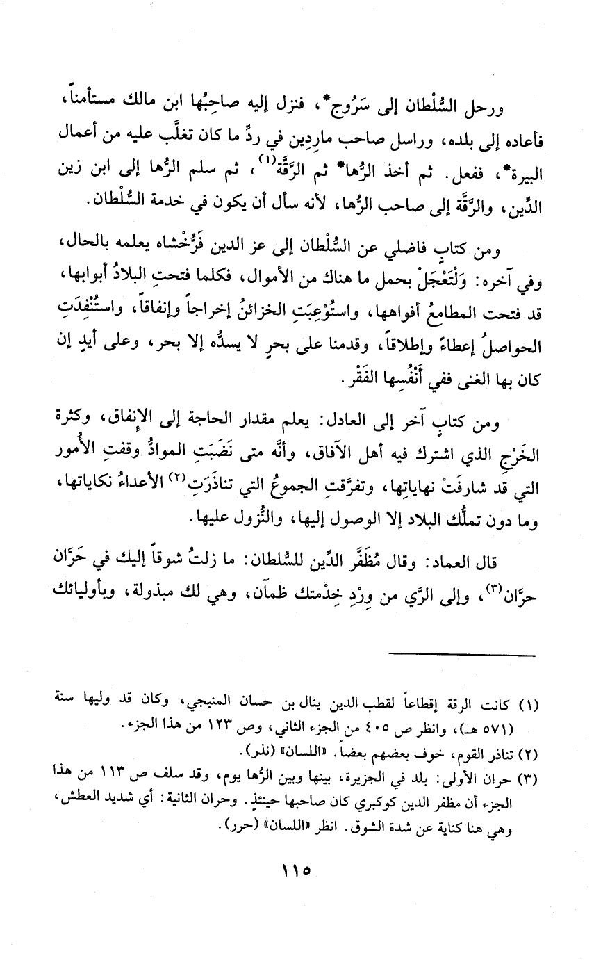 قَالَ الْعِمَاد وَقَالَ مظفر الدّين للسُّلْطَان مازلت شوقا إِلَيْك فِي حران حران وَإِلَى الرّيّ من ورد خدمتك ظمآن وَهِي لَك مبذولة وبأوليائك