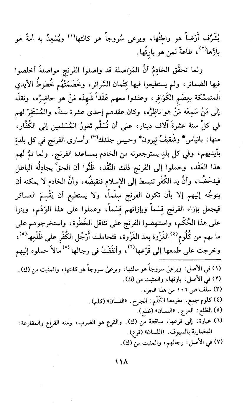 وَلما تمّ لَهُم هَذَا العقد وحملوا إِلَى الفرنج ذَلِك النَّقْد ظنُّوا أَن الْحق يجادله الْبَاطِل فيدحضه وَأَن يَد الْكفْر تنبسط إِلَى الْإِسْلَام فتقبضه وَأَن الْخَادِم لَا يُمكنهُ أَن يتَوَجَّه إِلَيْهِم إِلَّا بِأَن تكون الفرنج سلما وَلَا يَسْتَطِيع أَن يقسم العساكر فَيجْعَل بِإِزَاءِ الفرنج قسما وبإزائهم قسما وَعمِلُوا على هَذَا الْوَهم وبنوا على هَذَا الحكم واستنهضوا الفرنج على تثاقل الخطوة واستخرجوهم على مَا بهم من كلوم الْغَزْوَة بعد الْغَزْوَة فتحاملت أرجل الْكفْر على ظلعها وَخرجت على طمعها إِلَى قرعها وأنفقت فِي رجالها مَالا حملوه إِلَيْهِم