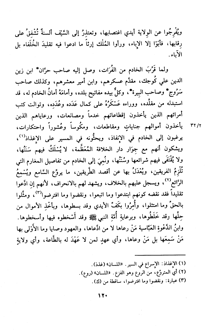 وَلما قرب الْخَادِم من الْفُرَات وصل إِلَيْهِ صَاحب حران ابْن زين الدّين عَليّ كوجك مقدم عَسْكَرهمْ وَابْن أَمِير معشرهم وَكَذَلِكَ صَاحب سروج وَصَاحب البيرة وكل بِيَدِهِ مَفَاتِيح بَلَده وأمامه أَمَان الْخَادِم لَهُ قد استبدله من مقلده ووراءه عسكره على كَمَال عدده وعدده وتوالت كتب أمرائهم الَّذين يَأْخُذُونَ إقطاعاتهم خدما ومصانعات ورعاياهم الَّذين يَأْخُذُونَ أَمْوَالهم جنايات ومقاطعات ومكوسا وعشورا واحتكارات يرغبون إِلَى الْخَادِم فِي الإنفاذ ويحثونه فِي الْمسير على الأغذاذ ويشكون أَنهم مَعَ جوَار دَار الْخلَافَة المعظمة لَا يسْلك فيهم سننها وَلَا يقتفى فيهم شرائعها وسننها ونمي إِلَى الْخَادِم من تفاصيل المغارم الَّتِي تلْزم الْفَرِيقَيْنِ ويعدل بهَا عَن أقصد الطَّرِيقَيْنِ مَا يروع السَّامع وَيسمع الرائع ويسجل عَلَيْهِم بِالْخِلَافِ وَيشْهد لَهُم بالانحراف لأَنهم إِن ادعوا تقليدا فقد نقضه كَونهم ابتدعوا وَمَا اتبعُوا وَنَقَضُوا وَمَا افترضوا ومثلوا بِالْحَقِّ وَمَا امتثلوا وَأمرُوا بكف الْأَيْدِي وَقد بسطوها وبأخذ الْأَمْوَال من حلهَا وَقد خلطوها وبرعاية أمة النَّبِي صلى الله عَلَيْهِ وَسلم وَقد أسخطوه فِيهَا وأسخطوها