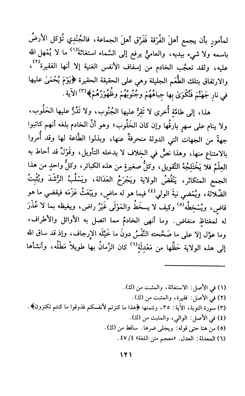 لمأمور بِأَن يجمع أهل الْفرْقَة فَفرق أهل الْجَمَاعَة فالجندي تُؤْكَل الأَرْض باسمه وَلَا شَيْء بيدَيْهِ والعامي يرفع إِلَى السَّمَاء استغاثة مَا لَا يُمْهل الله عَلَيْهِ وَلَقَد تعجب الْخَادِم من إسفاف الْأَنْفس الغنية إِلَّا أَنَّهَا الفقيرة والارتفاق بِتِلْكَ الطّعْم الجليلة وَهِي على الْحَقِيقَة الحقيرة {يَوْم يحمى عَلَيْهَا فِي نَار جَهَنَّم فتكوى بهَا جباههم وجنوبهم وظهورهم} الْآيَة