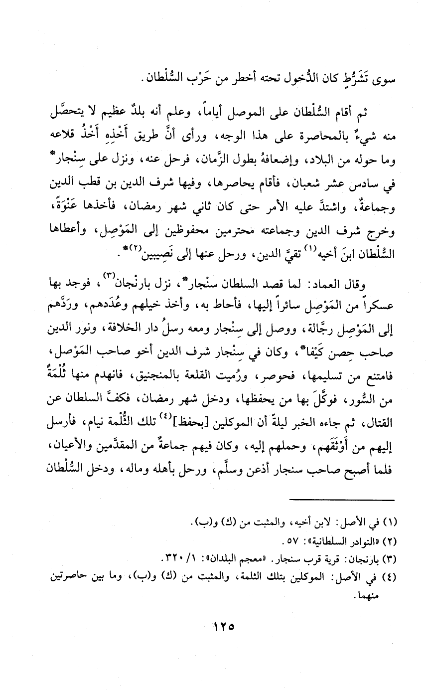 ثمَّ أَقَامَ السُّلْطَان على الْموصل أَيَّامًا وَعلم أَنه بلد عَظِيم لَا يتَحَصَّل مِنْهُ شَيْء بالمحاصرة على هَذَا الْوَجْه وَرَأى أَن طَرِيق أَخذه أَخذ قلاعه وَمَا حوله من الْبِلَاد وإضعافه بطول الزَّمَان فَرَحل عَنهُ وَنزل على سنجار فِي سادس عشر شعْبَان فَأَقَامَ يحاصرها وفيهَا شرف الدّين بن قطب الدّين وَجَمَاعَة وَاشْتَدَّ عَلَيْهِ الْأَمر حَتَّى كَانَ ثَانِي شهر رَمَضَان فَأَخذهَا عنْوَة وَخرج شرف الدّين وجماعته محترمين محفوظين إِلَى الْموصل وَأَعْطَاهَا السُّلْطَان ابْن أَخِيه تَقِيّ الدّين ورحل عَنْهَا إِلَى نَصِيبين