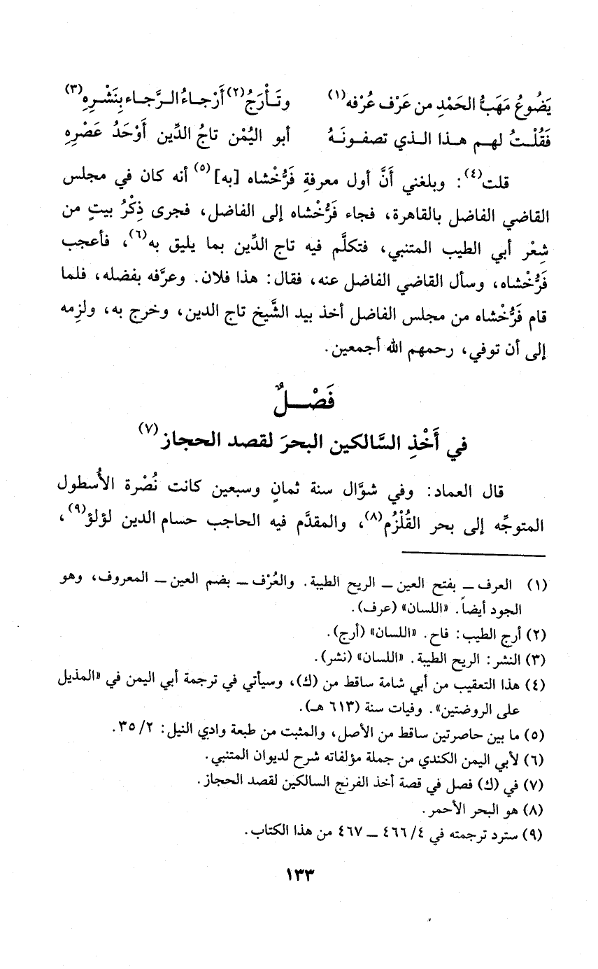 قلت وَبَلغنِي أَن أول معرفَة فرخشاه بِهِ أَنه كَانَ فِي مجْلِس القَاضِي الْفَاضِل بِالْقَاهِرَةِ فجَاء فرخشاه إِلَى الْفَاضِل فَجرى ذكر بَيت من شعر أبي الطّيب المتنبي فَتكلم فِيهِ تَاج الدّين بِمَا يَلِيق بِهِ فأعجب فرخشاه وَسَأَلَ القَاضِي الْفَاضِل عَنهُ فَقَالَ هَذَا فلَان