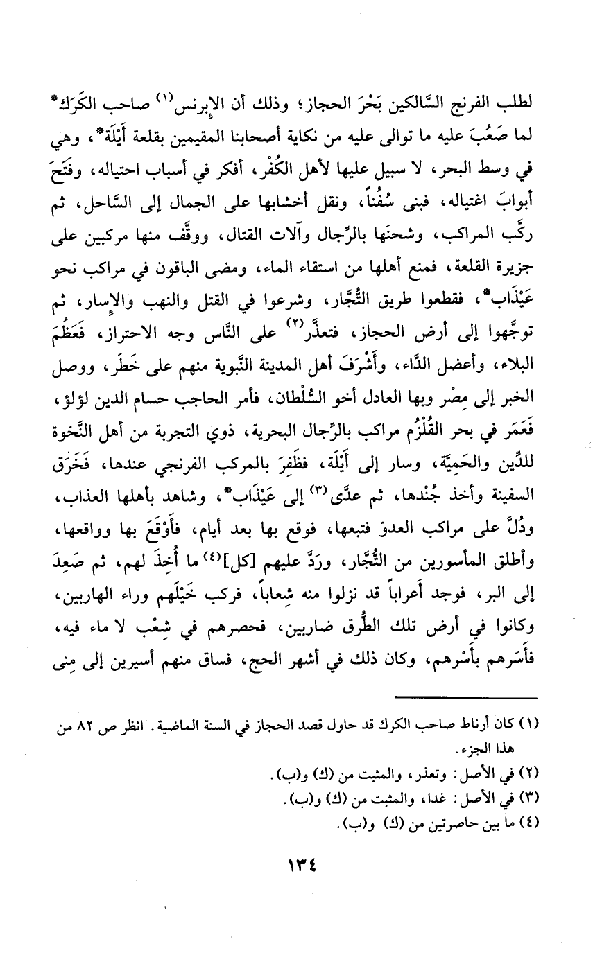 لطلب الفرنج السالكين بَحر الْحجاز وَذَلِكَ أَن الإبرنس صَاحب الكرك لما صَعب عَلَيْهِ مَا توالى عَلَيْهِ من نكاية أَصْحَابنَا المقيمين بقلعة أَيْلَة وَهِي فِي وسط الْبَحْر لَا سَبِيل عَلَيْهَا لأهل الْكفْر أفكر فِي أَسبَاب احتياله وَفتح أَبْوَاب اغتياله فَبنى سفنا وَنقل أخشابها على الْجمال إِلَى السَّاحِل ثمَّ ركب المراكب وشحنها بِالرِّجَالِ وآلات الْقِتَال ووقف مِنْهَا مركبين على جَزِيرَة القلعة فَمنع أَهلهَا من استقاء المَاء وَمضى الْبَاقُونَ فِي مراكب نَحْو عيذاب فَقطعُوا طَرِيق التُّجَّار وشرعوا فِي الْقَتْل والنهب والإسار ثمَّ توجهوا إِلَى أَرض الْحجاز فَتعذر على النَّاس وَجه الِاحْتِرَاز فَعظم الْبلَاء وأعضل الدَّاء وأشرف أهل الْمَدِينَة النَّبَوِيَّة مِنْهُم على خطر وَوصل الْخَبَر إِلَى مصر وَبهَا الْعَادِل أَخُو السُّلْطَان فَأمر الْحَاجِب حسام الدّين لُؤْلُؤ فعمر فِي بَحر القلزم مراكب بِالرِّجَالِ البحرية ذَوي التجربة من أهل النخوة للدّين وَالْحمية وَسَار إِلَى أَيْلَة فظفر بالمركب الفرنجي عِنْدهَا فخرق السَّفِينَة وَأخذ جندها ثمَّ عدى إِلَى عيذاب وَشَاهد بِأَهْلِهَا الْعَذَاب وَدلّ على مراكب الْعَدو فتبعها فَوَقع بهَا بعد أَيَّام فأوقع بهَا وواقعها وَأطلق المأسورين من التُّجَّار ورد عَلَيْهِم كل مَا أَخذ لَهُم ثمَّ صعد إِلَى الْبر فَوجدَ أعرابا قد نزلُوا مِنْهُ شعابا فَركب خيلهم وَرَاء الهاربين وَكَانُوا فِي أَرض تِلْكَ الطّرق ضاربين فحصرهم فِي شعب لَا مَاء فِيهِ فأسرهم بأسرهم وَكَانَ ذَلِك فِي أشهر الْحَج فساق مِنْهُم أسيرين إِلَى منى