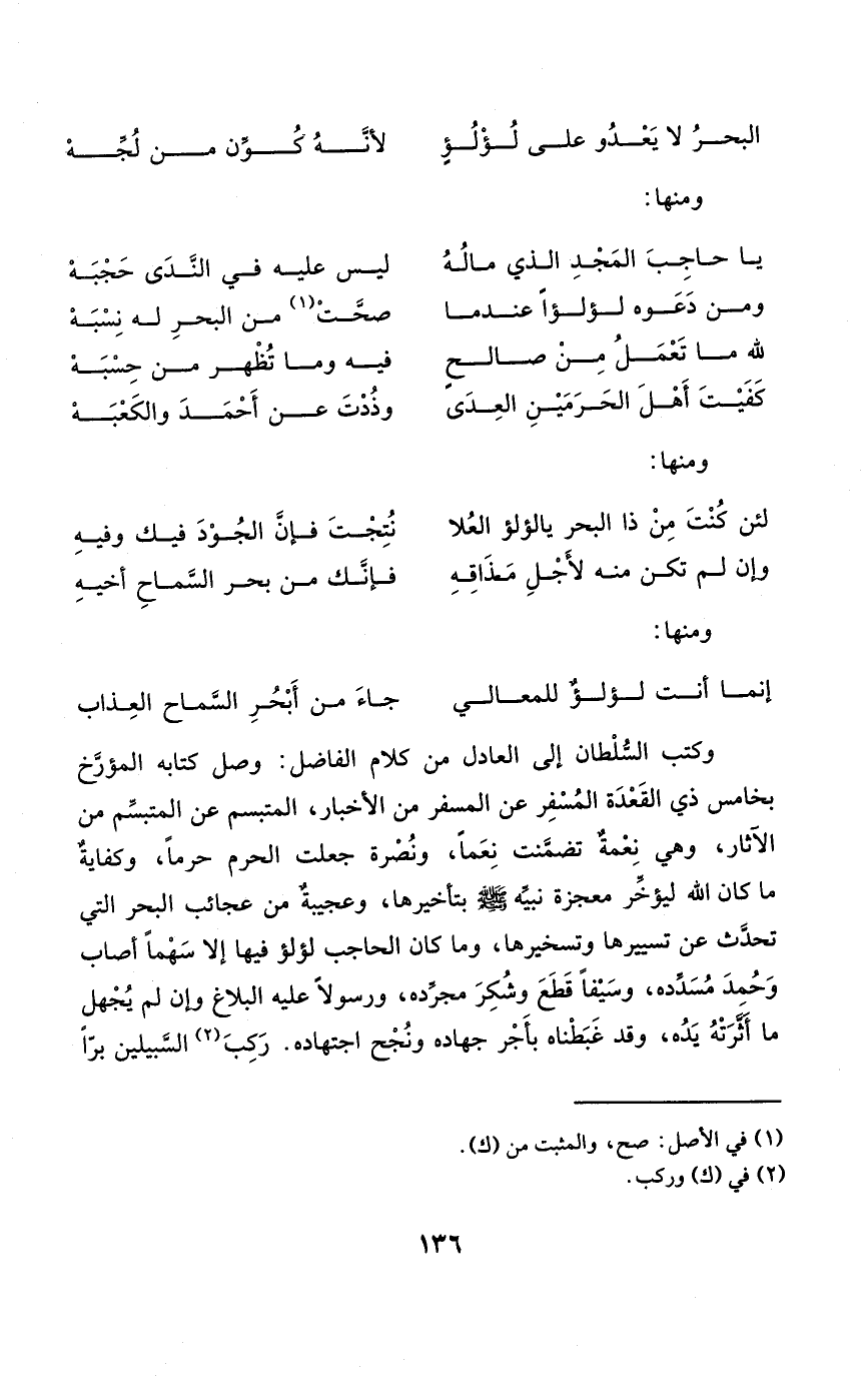 وَكتب السُّلْطَان إِلَى الْعَادِل من كَلَام الْفَاضِل وصل كِتَابه المؤرخ بخامس ذِي الْقعدَة المسفر عَن المسفر من الْأَخْبَار المتبسم عَن المتبسم من الْآثَار وَهِي نعْمَة تَضَمَّنت نعما ونصرة جعلت الْحرم حرما وكفاية مَا كَانَ الله ليؤخر معْجزَة نبيه صلى الله عَلَيْهِ وَسلم بتأخيرها وعجيبة من عجائب الْبَحْر الَّتِي تحدث عَن تسييرها وتسخيرها وَمَا كَانَ الْحَاجِب لُؤْلُؤ فِيهَا إِلَّا سَهْما أصَاب وَحمد مسدده وسيفا قطع وشكر مجرده ورسولا عَلَيْهِ الْبَلَاغ وَإِن لم يجهل مَا أثرته يَده وَقد غبطناه بِأَجْر جهاده ونجح اجْتِهَاده