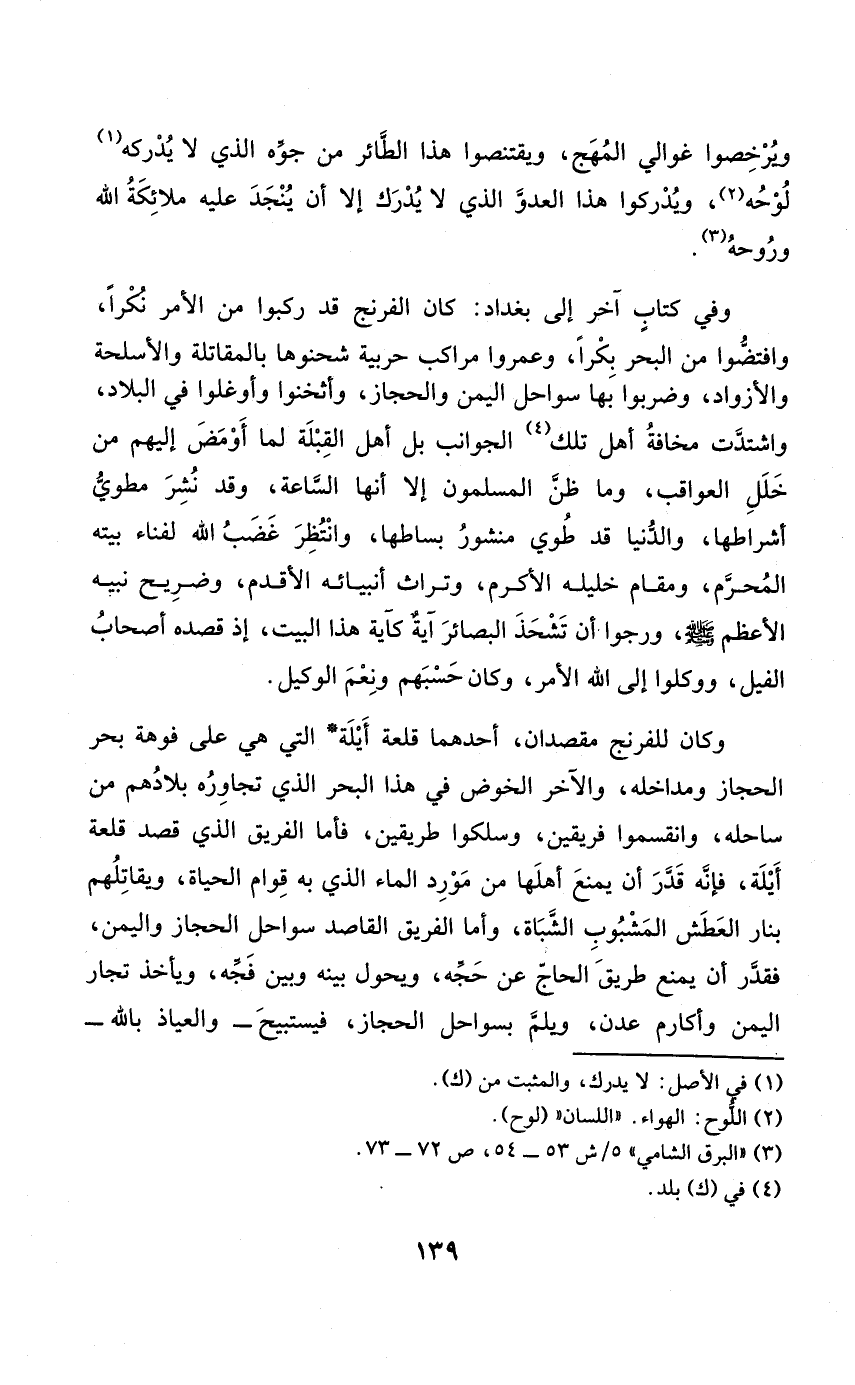 وَكَانَ للفرنج مقصدان أَحدهمَا قلعة أَيْلَة الَّتِي هِيَ على فوهة بَحر الْحجاز ومداخله وَالْآخر الْخَوْض فِي هَذَا الْبَحْر الَّذِي تجاوره بِلَادهمْ من ساحله وانقسموا فريقين وسلكوا طَرِيقين فَأَما الْفَرِيق الَّذِي قصد قلعة أَيْلَة فَإِنَّهُ قدر أَن يمْنَع أَهلهَا من مورد المَاء الَّذِي بِهِ قوام الْحَيَاة ويقاتلهم بِنَار الْعَطش المشبوب الشباة وَأما الْفَرِيق القاصد سواحل الْحجاز واليمن فَقدر أَن يمْنَع طَرِيق الْحَاج عَن حجه ويحول بَينه وَبَين فجه وَيَأْخُذ تجار الْيمن وأكارم عدن ويلم بسواحل الْحجاز فيستبيح وَالْعِيَاذ بِاللَّه
