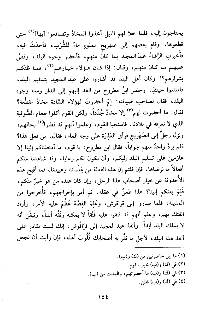 يَحْتَاجُونَ إِلَيْهِ فَلَمَّا خلا لَهُم اللَّيْل أخذُوا المخاد وتصافعوا بهَا حَتَّى قطعوها وَقَامَ بَعضهم إِلَى صهريج مَمْلُوء مَاء للشُّرْب فأحدث فِيهِ فَأخْبرت الرقباء عبد الْمجِيد بِمَا كَانَ مِنْهُم فأحضر وُجُوه الْبَلَد وقص عَلَيْهِم مَا كَانَ مِنْهُم وَقَالَ إِذا كَانَ هَؤُلَاءِ خيارهم فَمَا ظنكم بشرارهم وَكَانَ أهل الْبَلَد قد أشاروا على عبد الْمجِيد بِتَسْلِيم الْبَلَد فامتنعوا حِينَئِذٍ
