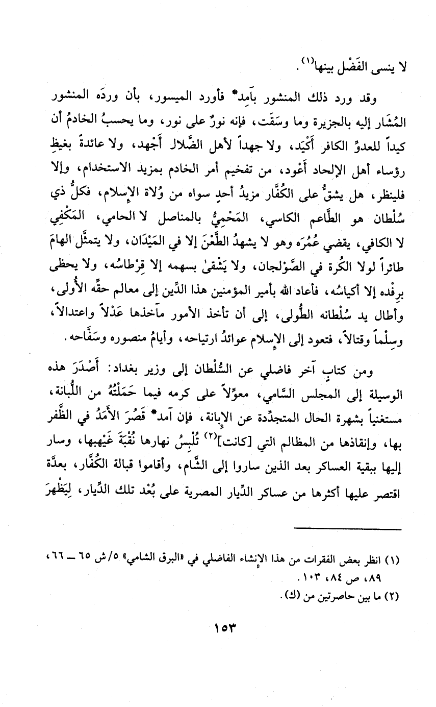 وَمن كتاب آخر فاضلي عَن السُّلْطَان إِلَى وَزِير بَغْدَاد أصدر هَذِه الْوَسِيلَة إِلَى الْمجْلس السَّامِي معولا على كرمه فِيمَا حَملته من اللبانة مستغنيا بشهرة الْحَال المتجددة عَن الْإِبَانَة فَإِن آمد قصر الأمد فِي الظفر بهَا وإنقاذها من الْمَظَالِم الَّتِي كَانَت تلبس نَهَارهَا نقبة غيهبها وَسَار إِلَيْهَا بِبَقِيَّة العساكر يعد الَّذين سَارُوا إِلَى الشَّام وَأَقَامُوا قبالة الْكفَّار بعدة اقْتصر عَلَيْهَا أَكْثَرهَا من عَسَاكِر الديار المصرية على بعد تِلْكَ الديار ليظْهر