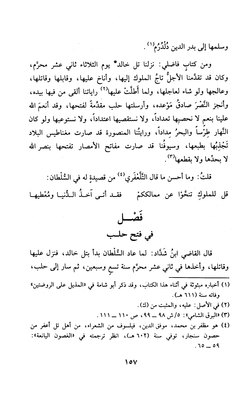 وَمن كتاب فاضلي نزلنَا تل خَالِد يَوْم الثُّلَاثَاء ثَانِي عشر محرم وَكَانَ قد تقدمنا الْأَجَل تَاج الْمُلُوك إِلَيْهَا وأناخ عَلَيْهَا وقابلها وقاتلها وعالجها وَلَو شَاءَ لعاجلها وَلما أطلت عَلَيْهَا راياتنا ألْقى من فِيهَا بِيَدِهِ وأنجز النَّصْر صَادِق موعده وأرسلتها حلب مُقَدّمَة لفتحها وَقد أنعم الله علينا بنعم لَا نحصيها تعدادا وَلَا نستقصيها اعتدادا وَلَا نستوعبها وَلَو كَانَ النَّهَار طرسا وَالْبَحْر مدادا ورايتنا المنصورة قد صَارَت مغناطيس الْبِلَاد تجذبها بطبعها وسيوفنا قد صَارَت مفاتح الْأَمْصَار تفتحها بنصر الله لَا بحدها وَلَا بقطعها