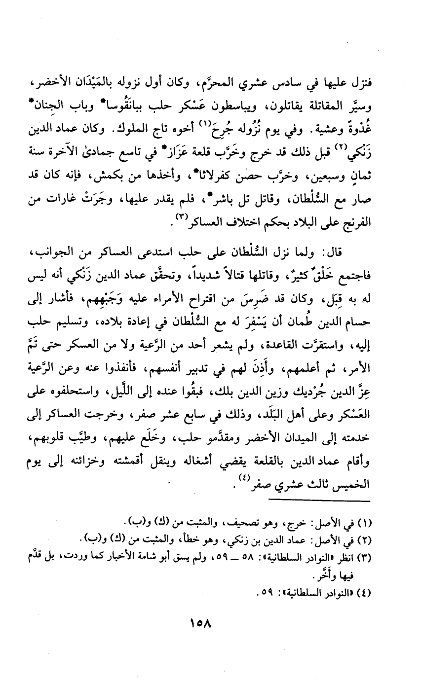 قَالَ وَلما نزل السُّلْطَان على حلب استدعى العساكر من الجوانب فَاجْتمع خلق كثير وقاتلها قتالا شَدِيدا وَتحقّق عماد الدّين زنكي أَنه لَيْسَ لَهُ بِهِ قبل وَكَانَ قد ضرس من اقتراح الْأُمَرَاء عَلَيْهِ وجبههم فَأَشَارَ إِلَى حسام الدّين طمان أَن يسفر لَهُ مَعَ السُّلْطَان فِي إِعَادَة بِلَاده وَتَسْلِيم حلب إِلَيْهِ واستقرت الْقَاعِدَة وَلم يشْعر أحد من الرّعية وَلَا من الْعَسْكَر حَتَّى تمّ الْأَمر ثمَّ أعلمهم وَأذن لَهُم فِي تَدْبِير أنفسهم فأنفذوا عَنهُ وَعَن الرّعية عز الدّين جرديك وزين الدّين بلك فبقوا عِنْده إِلَى اللَّيْل واستحلفوه على الْعَسْكَر وعَلى أهل الْبَلَد وَذَلِكَ فِي سَابِع عشر صفر وَخرجت العساكر إِلَى خدمته إِلَى الميدان الْأَخْضَر ومقدمو حلب وخلع عَلَيْهِم وَطيب قُلُوبهم وَأقَام عماد الدّين بالقلعة يقْضِي أشغاله وينقل أقمشته وخزائنه إِلَى يَوْم الْخَمِيس ثَالِث عشري صفر
