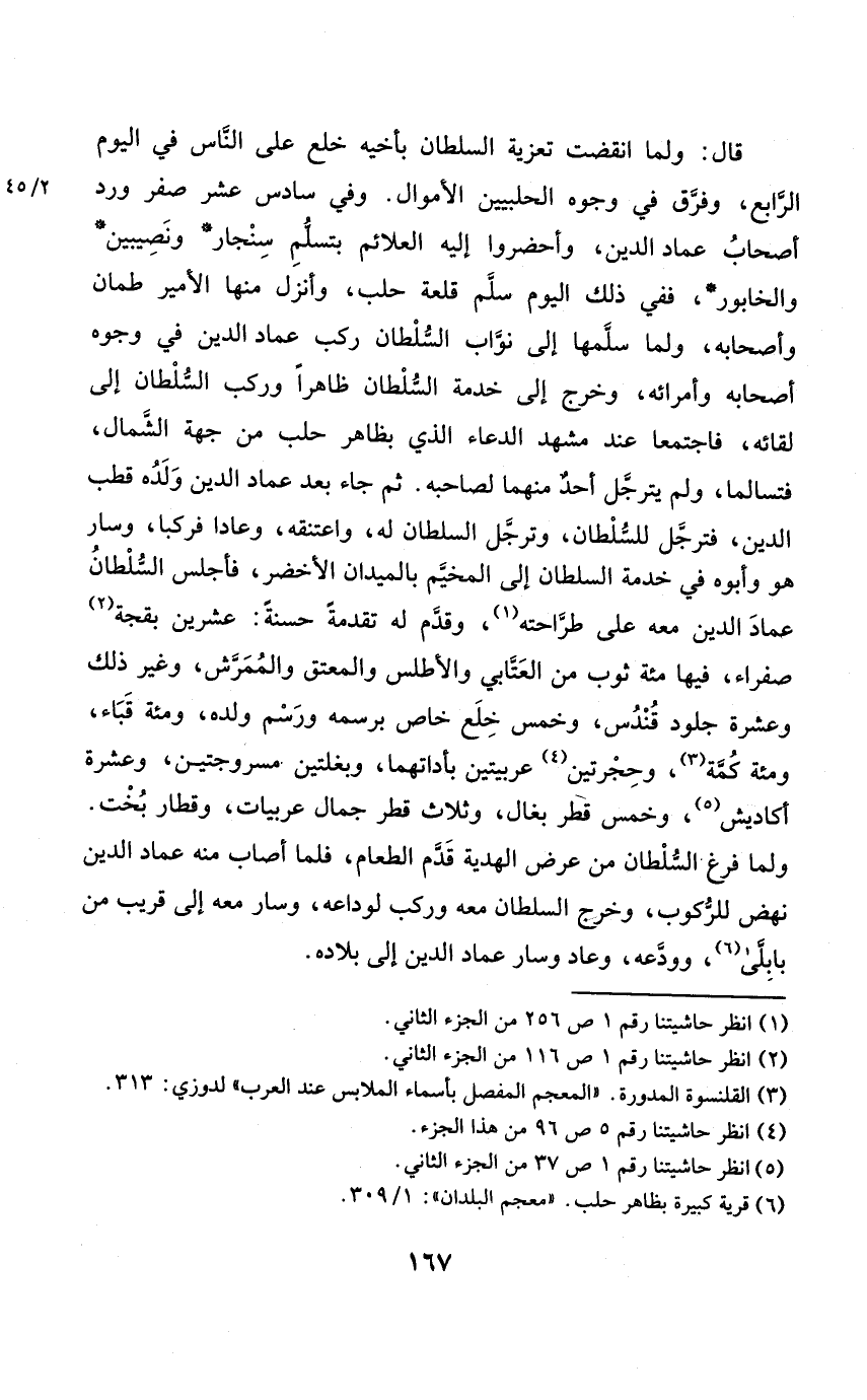 قَالَ وَلما انْقَضتْ تَعْزِيَة السُّلْطَان بأَخيه خلع على النَّاس فِي الْيَوْم الرَّابِع وَفرق فِي وُجُوه الحلبيين الْأَمْوَال