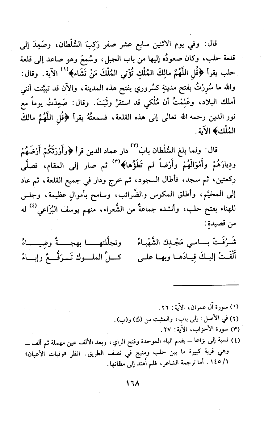 قَالَ وَفِي يَوْم الِاثْنَيْنِ سَابِع عشر صفر ركب السُّلْطَان وَصعد إِلَى قلعة حلب وَكَانَ صُعُوده إِلَيْهَا من بَاب الْجَبَل وَسمع وَهُوَ صاعد إِلَى قلعة حلب يقْرَأ {قل اللَّهُمَّ مَالك الْملك تؤتي الْملك من تشَاء} الْآيَة وَقَالَ وَالله مَا سررت بِفَتْح مَدِينَة كسروري بِفَتْح هَذِه الْمَدِينَة والآن قد تبينت أنني أملك الْبِلَاد وَعلمت أَن ملكي قد اسْتَقر وَثَبت
