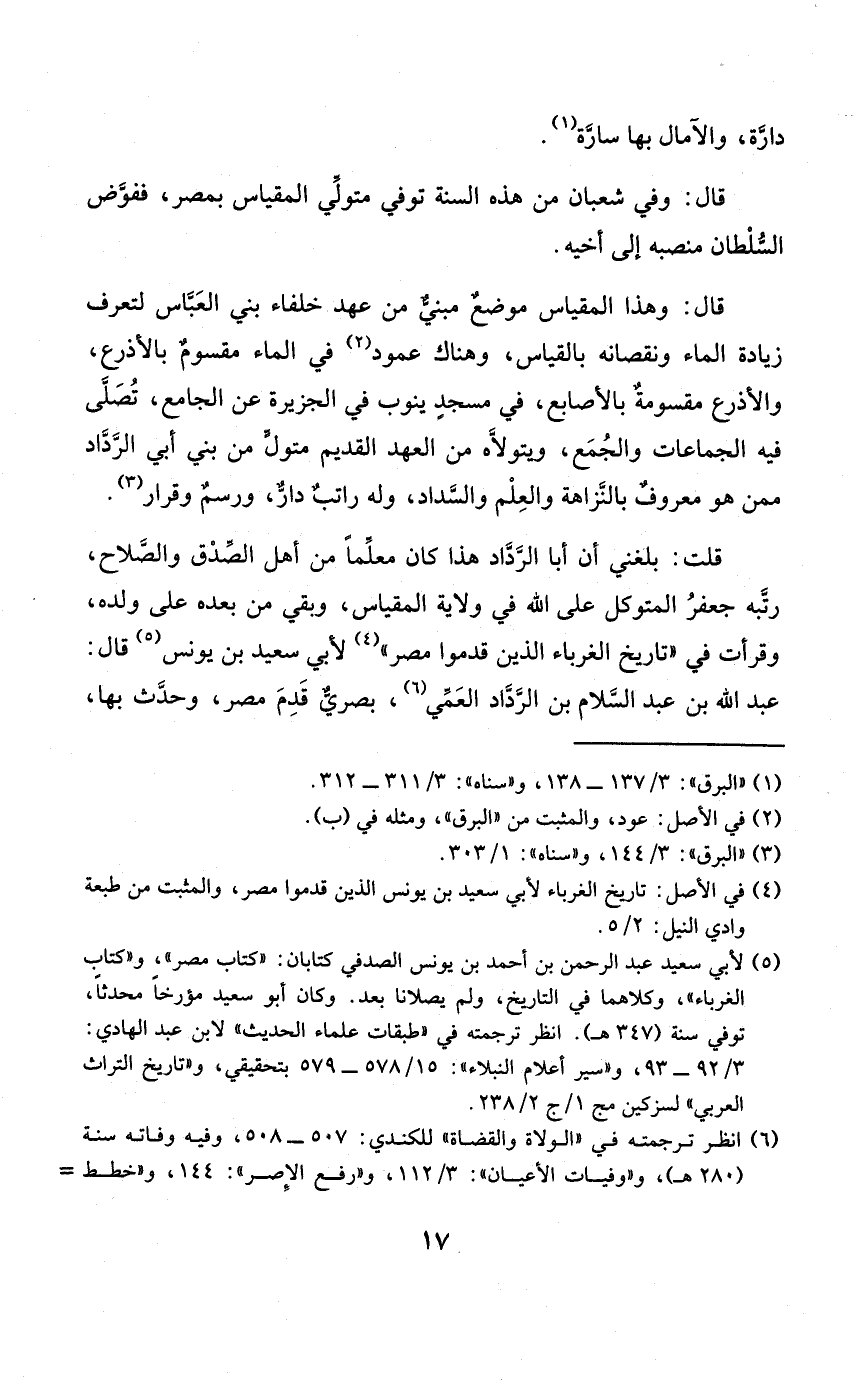 قَالَ وَهَذَا المقياس مَوضِع مَبْنِيّ من عهد خلفاء بني الْعَبَّاس لتعرف زِيَادَة المَاء ونقصانه بِالْقِيَاسِ وَهُنَاكَ عَمُود فِي المَاء مقسوم بالأذرع والأذرع مقسومة بالأصابع فِي مَسْجِد يَنُوب فِي الجزيرة عَن الْجَامِع تصلى فِيهِ الْجَمَاعَات وَالْجمع ويتولاه من الْعَهْد الْقَدِيم متول من بني أبي الرداد مِمَّن هُوَ مَعْرُوف بالنزاهة وَالْعلم والسداد وَله راتب دَار ورسم وقرار