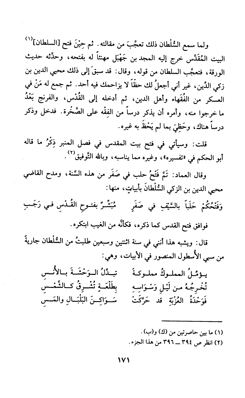 (وفتحكم حَلبًا بِالسَّيْفِ فِي صفر ... مُبشر بفتوح الْقُدس فِي رَجَب)