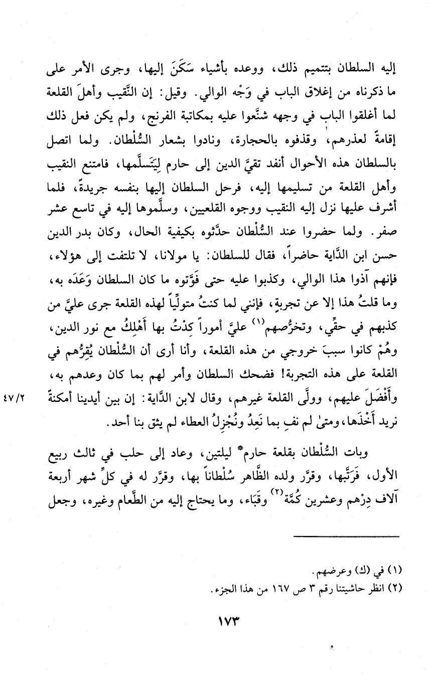 وَلما حَضَرُوا عِنْد السُّلْطَان حدثوه بكيفية الْحَال وَكَانَ بدر الدّين حسن ابْن الداية حَاضرا فَقَالَ للسُّلْطَان يَا مَوْلَانَا لَا تلْتَفت إِلَى هَؤُلَاءِ فَإِنَّهُم آذوا هَذَا الْوَالِي وكذبوا عَلَيْهِ حَتَّى فوتوه مَا كَانَ السُّلْطَان وعده بِهِ وَمَا قلت هَذَا إِلَّا عَن تجربة فإنني لما كنت مُتَوَلِّيًا لهَذِهِ القلعة جرى عَليّ من كذبهمْ فِي حَقي وتخرصهم عَليّ أمورا كدت بهَا أهلك مَعَ نور الدّين وهم كَانُوا سَبَب خروجي من هَذِه القلعة وَأَنا أرى أَن السُّلْطَان يقرهم فِي القلعة على هَذِه التجربة فَضَحِك السُّلْطَان وَأمر لَهُم بِمَا كَانَ وعدهم بِهِ وَأفضل عَلَيْهِم وَولى القلعة غَيرهم وَقَالَ لِابْنِ الداية إِن بَين أَيْدِينَا أمكنة نُرِيد أَخذهَا وَمَتى لم نف بِمَا نعد ونجزل الْعَطاء لم يَثِق بِنَا أحد